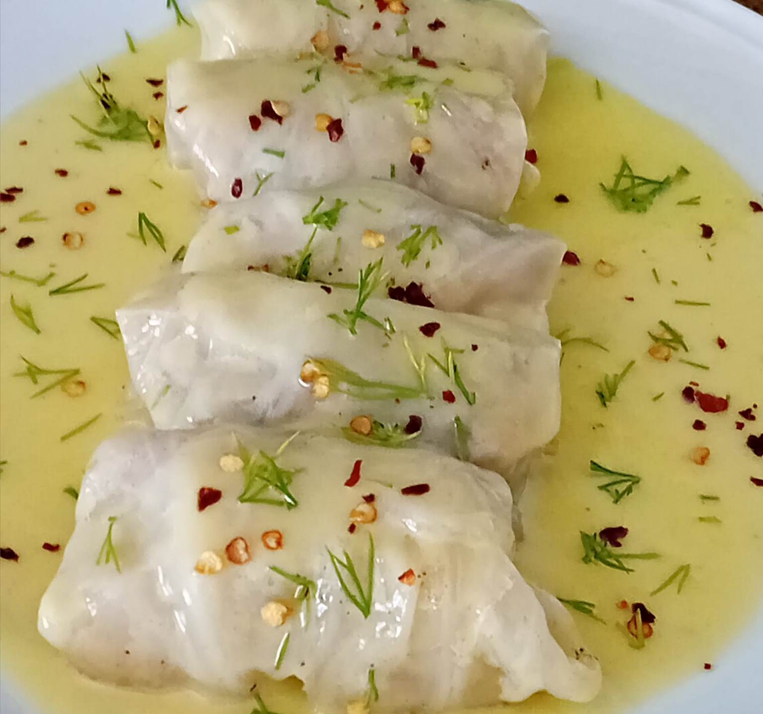 Βάζουμε 1-2 κουταλιές της σούπας από τη γέμιση σε κάθε φύλλο λάχανου και τυλίγουμε σε σφιχτό ρολό.
