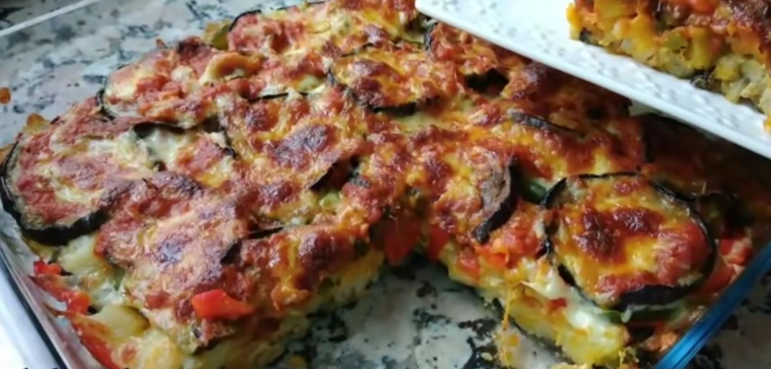 Παίρνουμε ένα μεσαίο πυρέξ και βάζουμε στον πάτο μία στρώση μελιτζάνες. Βάζουμε από πάνω τις πατάτες, τις πιπεριές τη μισή σάλτσα ντομάτας και τέλος στρώνουμε τις υπόλοιπες μελιτζάνες.