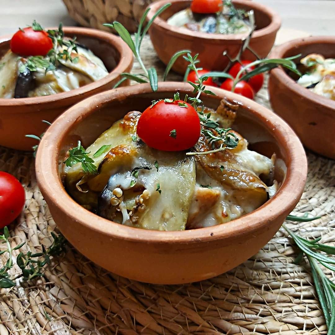 Σε μικρές κεραμικές φόρμες ή ένα πυρεξ, τοποθετήστε 3 φέτες μελιτζάνας, διαγώνια, έτσι ώστε τα άκρα τους να κρέμονται στην άκρη της φόρμας.