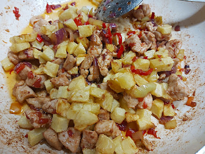 Το κρέας κόβεται σε κομμάτια και βράζεται σε καυτό λάδι.