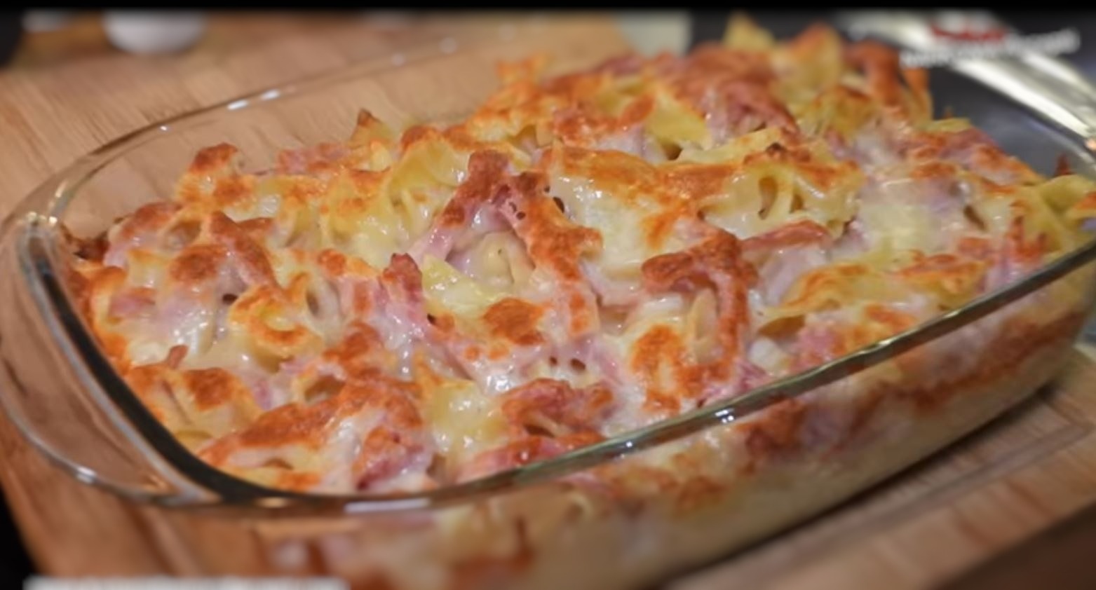 Στραγγίζουμε τα ζυμαρικά μας και αφήνουμε στην άκρη. Λαδώνουμε το πυρεξ μας ελαφρώς και αδειάζουμε τα μισά ζυμαρικά μέσα σε αυτό, από πάνω απλώνουμε τη μισή ποσότητα ζαμπόν και μετά τα υπόλοιπα ζυμαρικά και τα απλώνουμε.