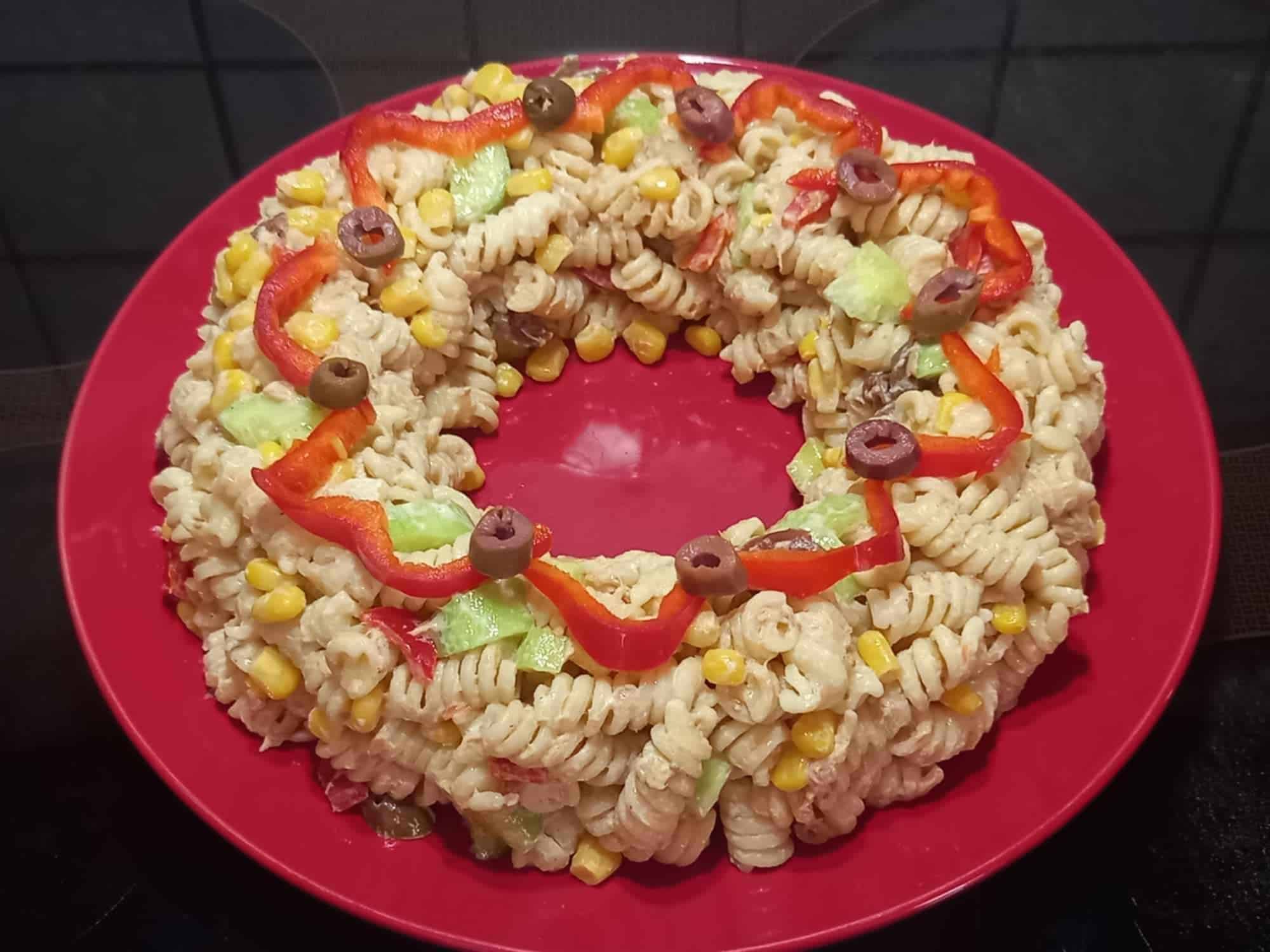 Βράζουμε τα μακαρόνια.Τα σουρώνουμε και τα βάζουμε σ΄ένα μεγάλο μπωλ.Προσθέτουμε όλα τα λαχανικά και τις ελιές.