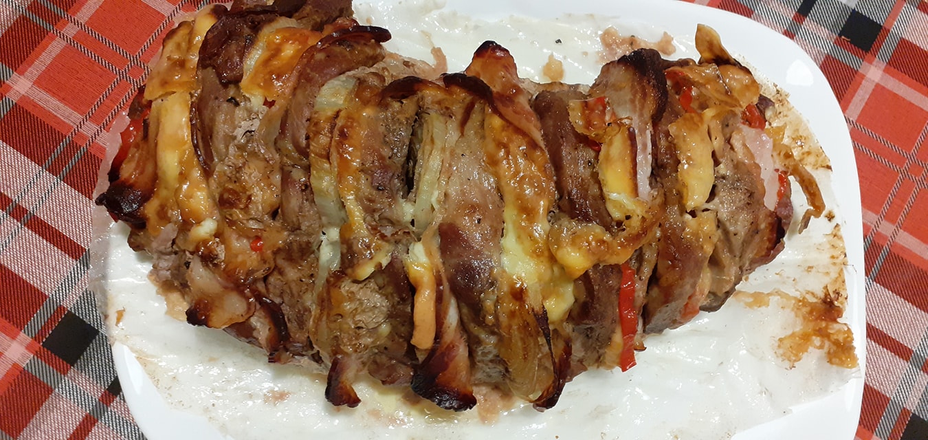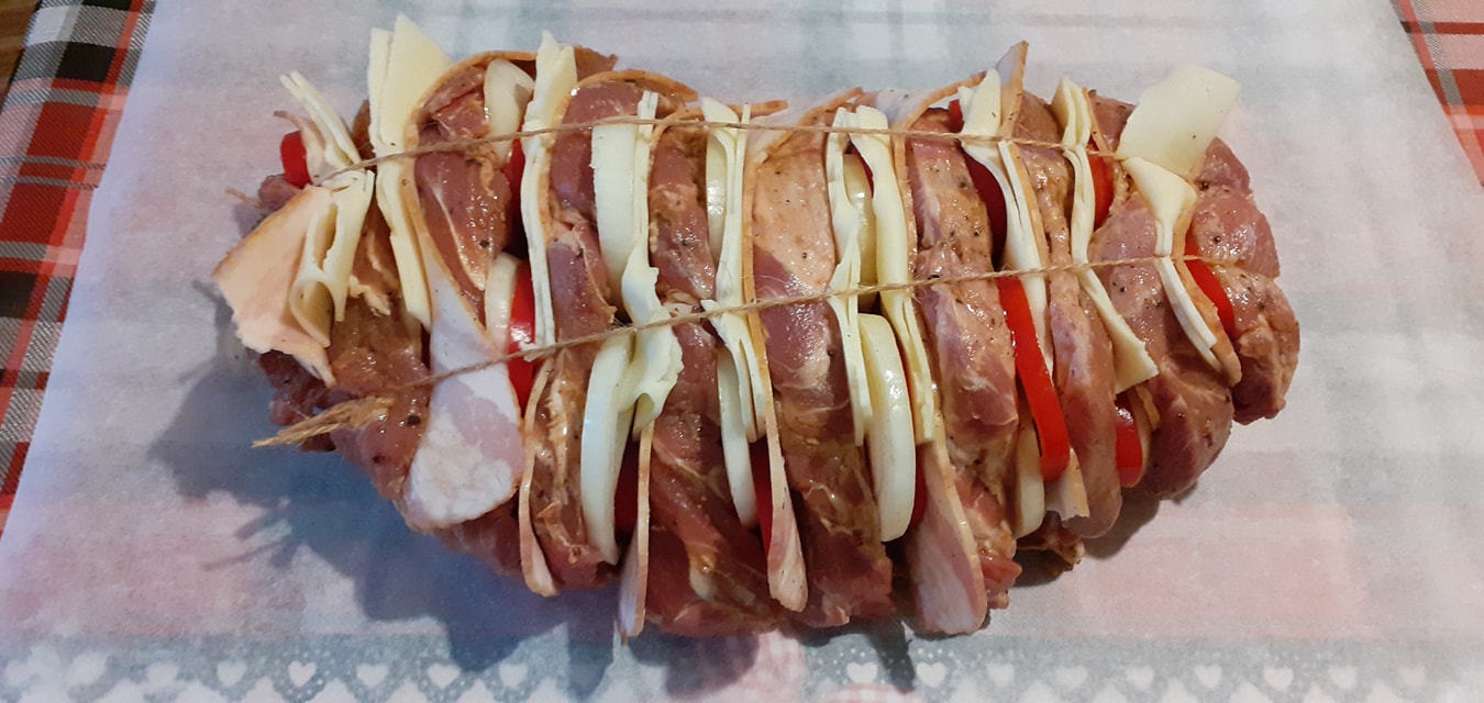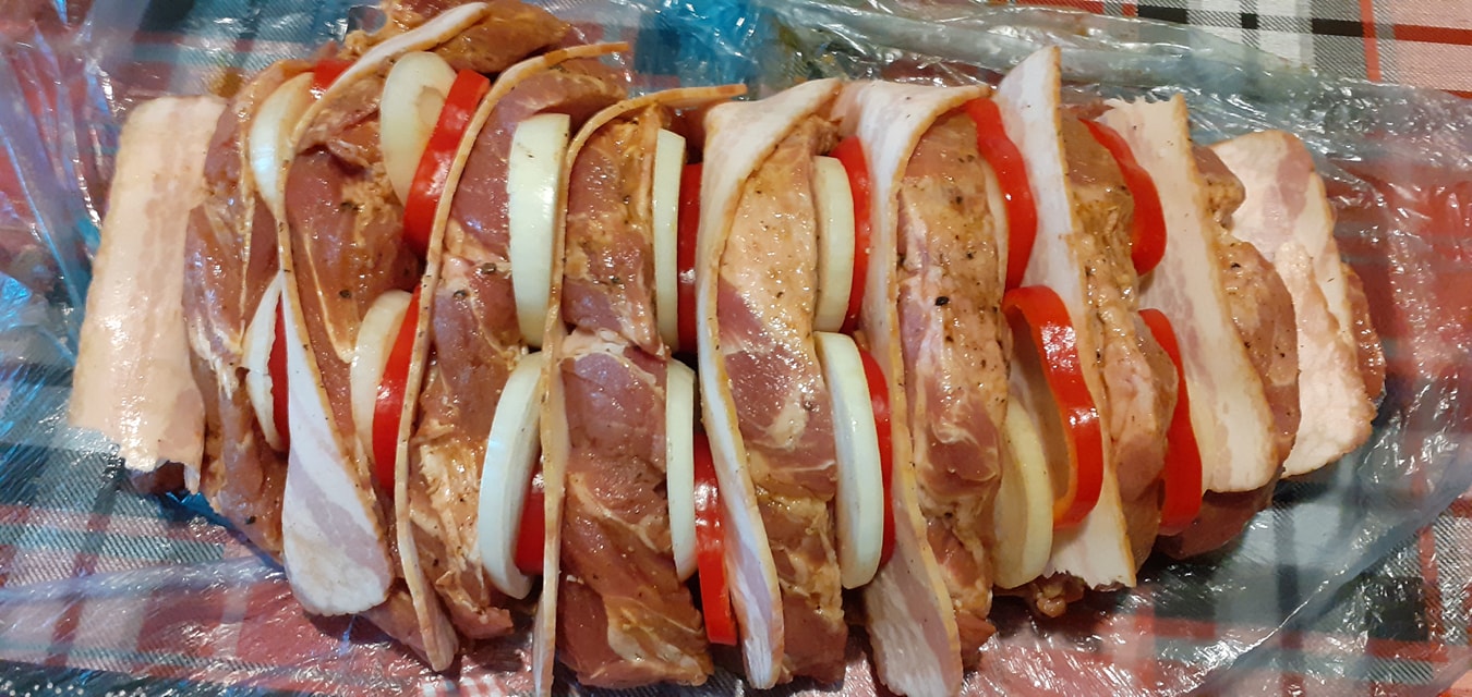 Όταν είναι έτοιμο για ψήσιμο, ξετυλίγουμε το μαριναρισμένο κρέας από το αλουμινόχαρτο. Σε κάθε “τσεπη” που έχουμε δημιουργήσει με τις φέτες, βάζουμε μία φέτα καπνιστό φιλέτο (ή μπέικον), μία φέτα κίτρινο τυρί και μία φέτα κρεμμύδι. Αν έχετε χώρο στις τσέπες σας, βάλτε και μερικές κόκκινες πιπεριές.