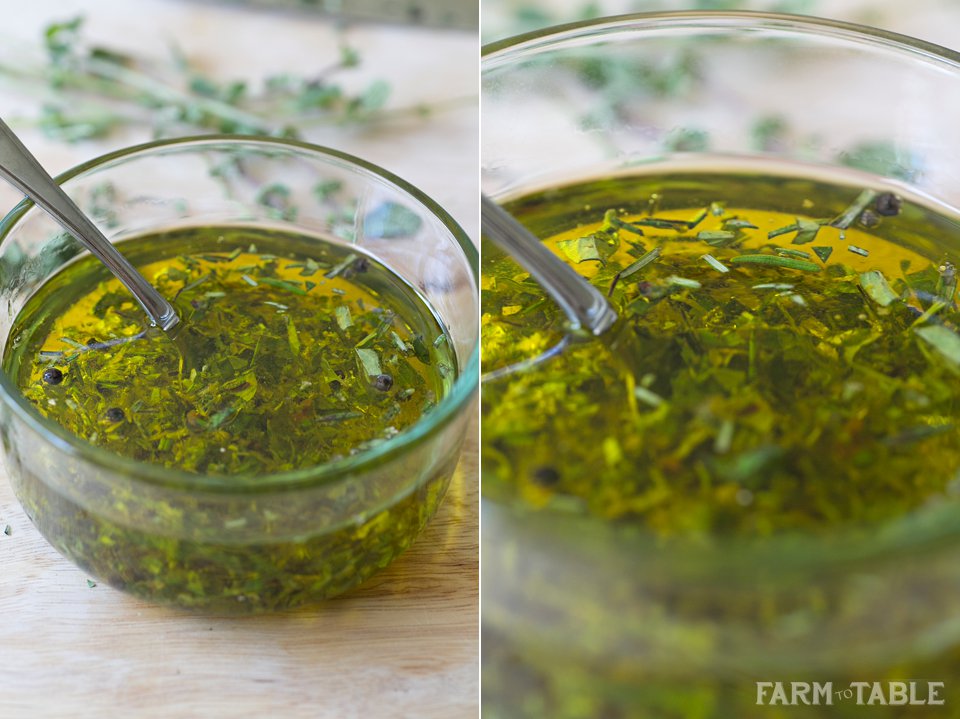 Σε ένα μικρό μπολ, συνδυάστε το λάδι, τα βότανα, τo πιπέρι, το ξύσμα λεμονιού και το χυμό και τις νιφάδες κόκκινου πιπεριού.