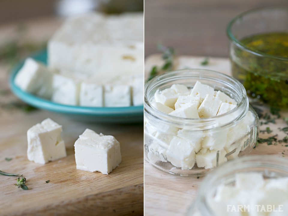 Βάλτε τα κύβους φέτας και το ελαιόλαδο σε 2 βάζα,