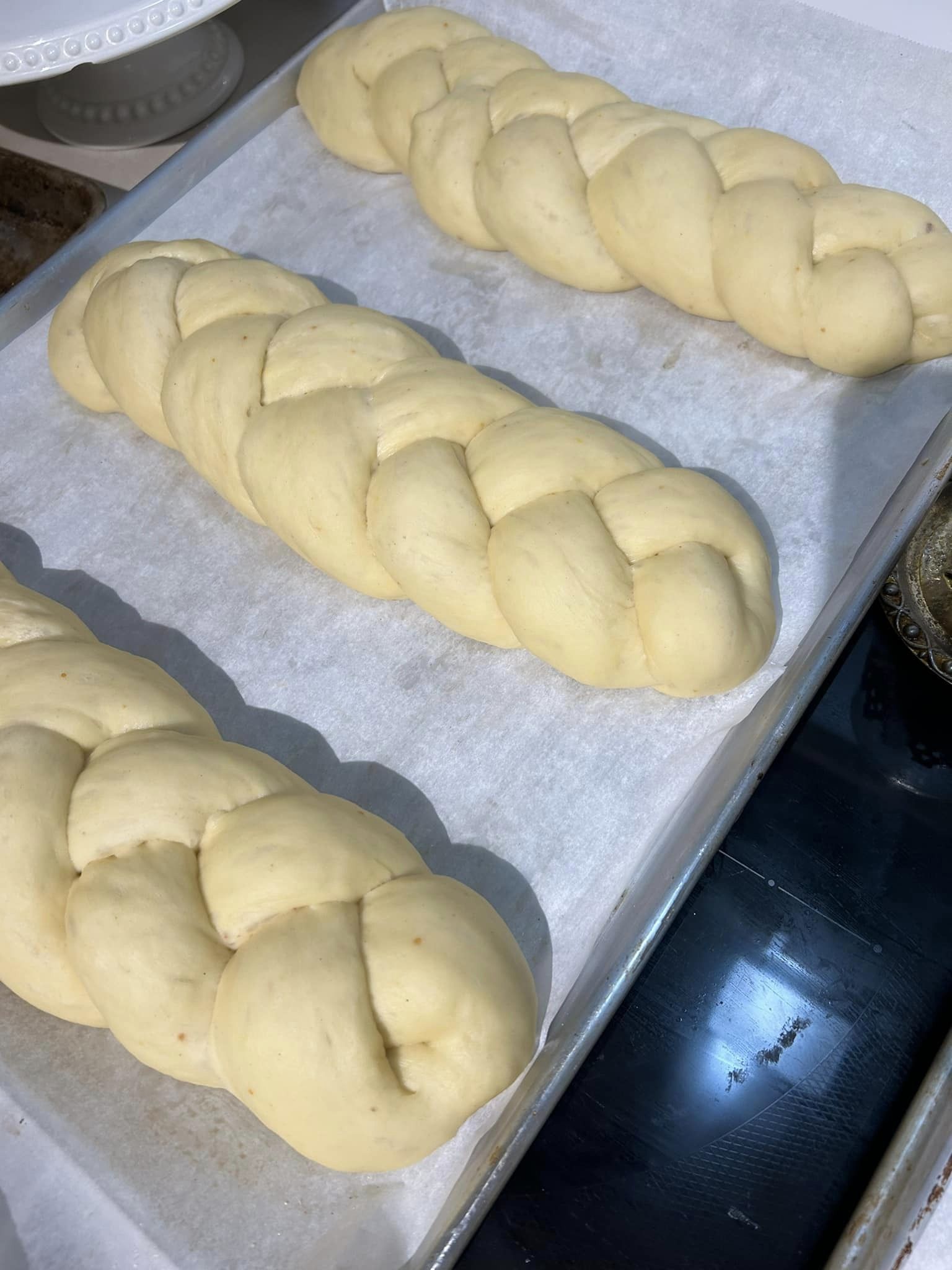 Οταν πλέξετε τα τσουρεκια τοποθετήστε τα τσουρέκια σε ταψιά στρωμένα με λαδόκολα, σκεπάστε τα με μια πετσέτα και αφήστε τα να φουσκώσουν για 1-2 ώρες, μέχρι να διπλασιαστούν σε μέγεθος.
