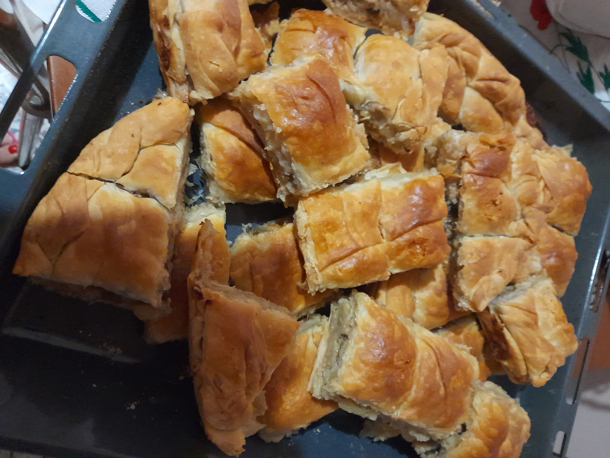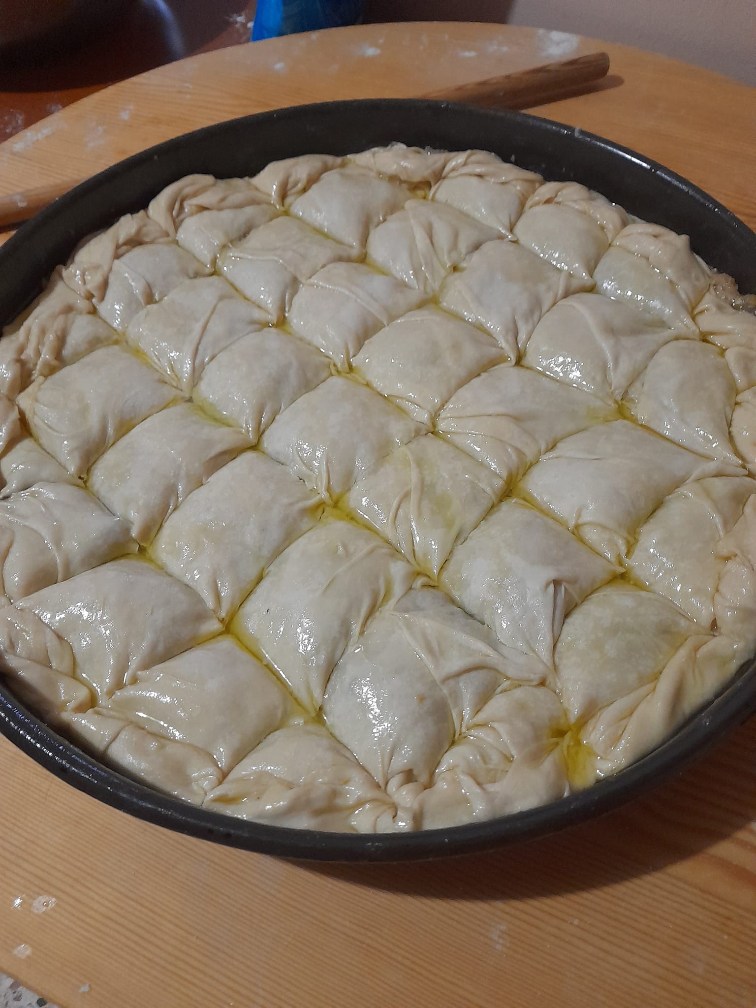 Το φύλλα τα ανοίγω με αλεύρι και νισεστέ εναλλάξ.