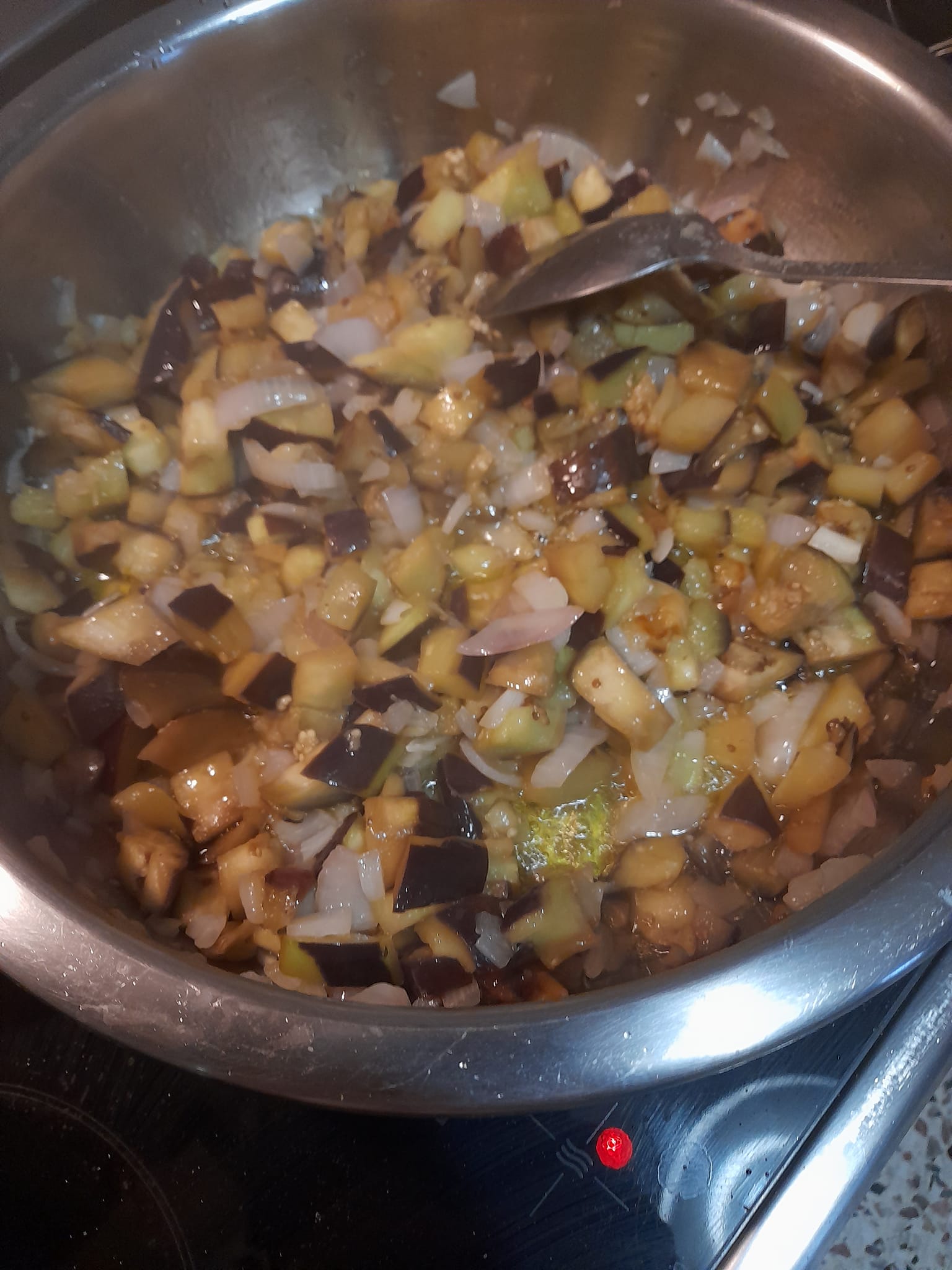 Σοτάρουμε τα κρεμμύδια και μετά την μελιτζάνα, προσθέτουμε 1 ποτήρι νερό και βράζουμε μέχρι να μαλακώσουν.