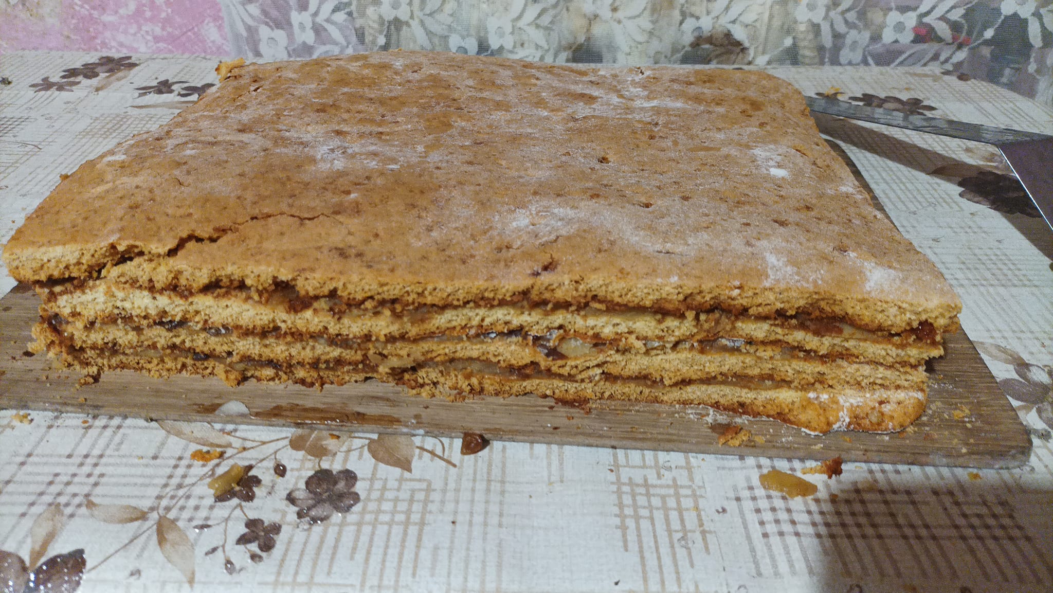 Απλώνουμε ομοιόμορφα το 1/3 της γέμισης με τα ζεστά μήλα στο πρώτο φύλλο, στη συνέχεια στο δεύτερο και καλύπτουμε με το τρίτο φύλλο. Βάζουμε και το άλλο 1/3 της γέμισης και το 4ο φύλλο. Λόγω της ζεστής γέμισης, τα φύλλα γίνονται αμέσως μαλακά και η γέμιση απορροφάται γρηγορότερα. Πασπαλίζουμε την έτοιμη **Μελωμένη Μηλόπιτα** μας με ζάχαρη άχνη και την αφήνουμε να μουλιάσει. Εγώ το άφησα στο δωμάτιο για μερικές ώρες. Και στη συνέχεια το έβαλα στο ψυγείο όλη τη νύχτα.