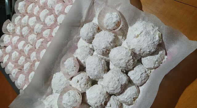 Ψήνουμε στους 180 βαθμούς για μισή ώρα περίπου ανάλογα με το φούρνο μας. Βγάζουμε αφού ροδίσουν ελαφρά και όπως είναι ζεστά τα ρίχνουμε μέσα σε ένα μπολ που έχουμε βάλει την άχνη μας και πασπαλίζουμε και από πάνω..