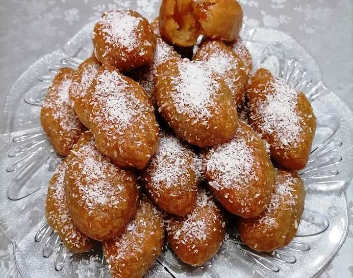 Βράζουμε τα υλικά για το σιρόπι για 7 με 8 λεπτά από την έναρξη του βρασμού. Αφήνουμε τα γλυκά να κρυώσουν εντελώς και τα βουτάμε στο καυτό σιρόπι για λίγα δευτερόλεπτα Στη συνέχεια τα κυλάμε στο ινδοκάρυδο μέχρι να καλυφθούν πλήρως.
