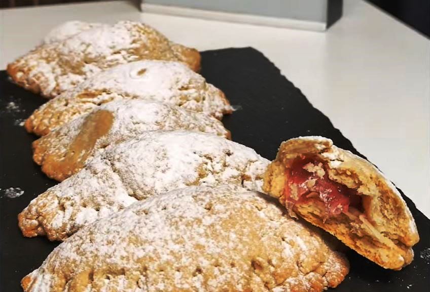 Την ανοίγουμε με τον τρόπο που βλέπετε βάζουμε ένα κομμάτι λουκούμι με γεύση τριαντάφυλλο και λίγο αμύγδαλο φίλε και τα