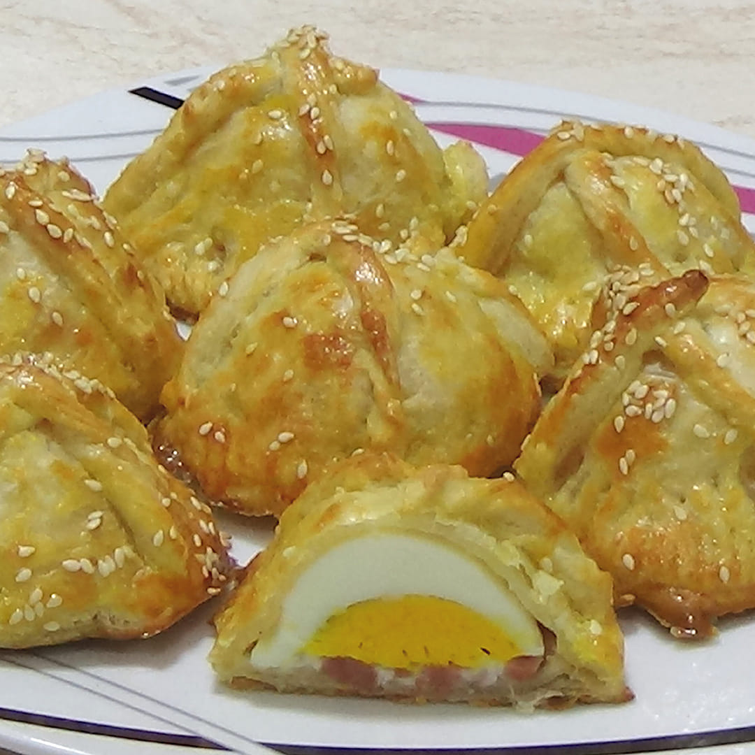 Ανακατεύουμε το τυρί κρέμα με το ζαμπόν. Προσθέστε αλάτι για γεύση. Στον μικρό κύκλο βάζουμε λίγη γέμιση και μισό βραστό αυγό.
