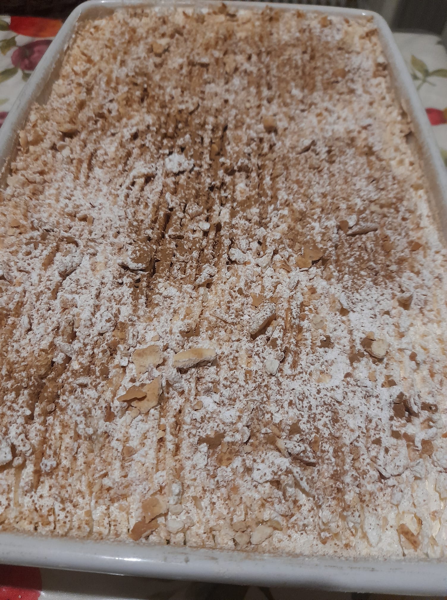 Στρώνω την σαντιγι και από πάνω τρίβω με τα χέρια κράκερς επίσης ρίχβω ζάχαρη άχνη και κανέλα το βάζω στο ψυγείο για 5 ώρες