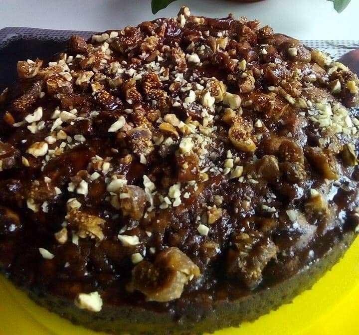 Από πάνω ψιλοκομμένα καρύδια και αποξηραμένα σύκα.