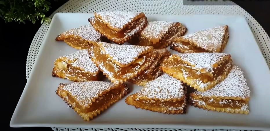 Ανοίγω τη ζύμη σε ένα παραλληλόγραμμο, το οποίο τετραγωνίζω, χωρίζω τη ζύμη σε 9 τετράγωνα μέρη και στο κάθε ένα βάζω 1 κουταλιά από το μείγμα του μήλου. Διπλώνω τη μία γωνία με την απέναντι, ώστε να σχηματιστεί ένα τρίγωνο.