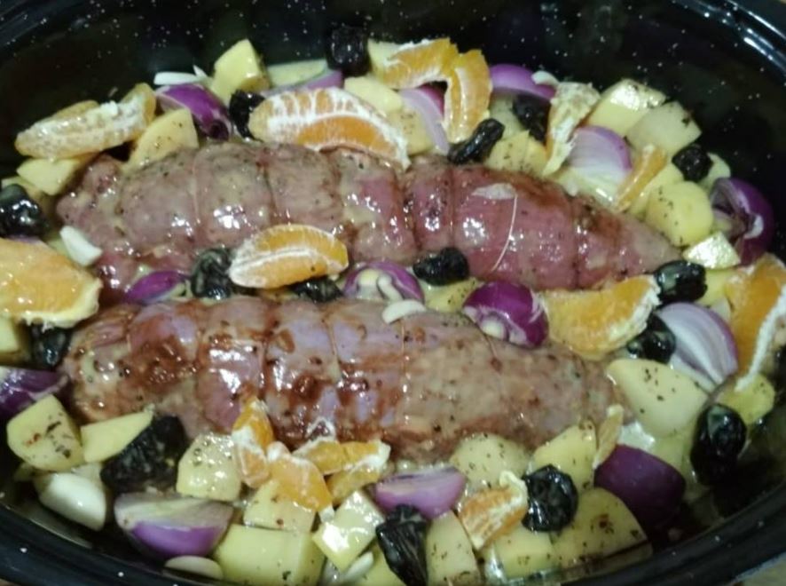 Τις τοποθετούμε γύρο από το κρέας και ανάμεσα βάζουμε τα δαμάσκηνα τα κρεμμύδια και το πορτοκάλι.
