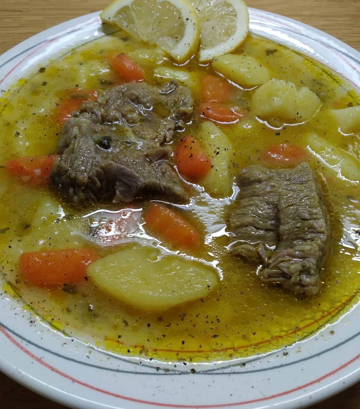 4. Βράσιμο: Ρίχνουμε το νερό (10 φλιτζάνια), αλάτι και πιπέρι . Αφήνουμε τη σούπα να πάρει δυνατή βράση . Μετά, χαμηλώνουμε τη φωτιά και σιγοβράζουμε για περίπου 1 ώρα και 30 λεπτά , μέχρι να μαλακώσει το κρέας και οι πατάτες. Ξαφρίζουμε αν χρειαστεί.