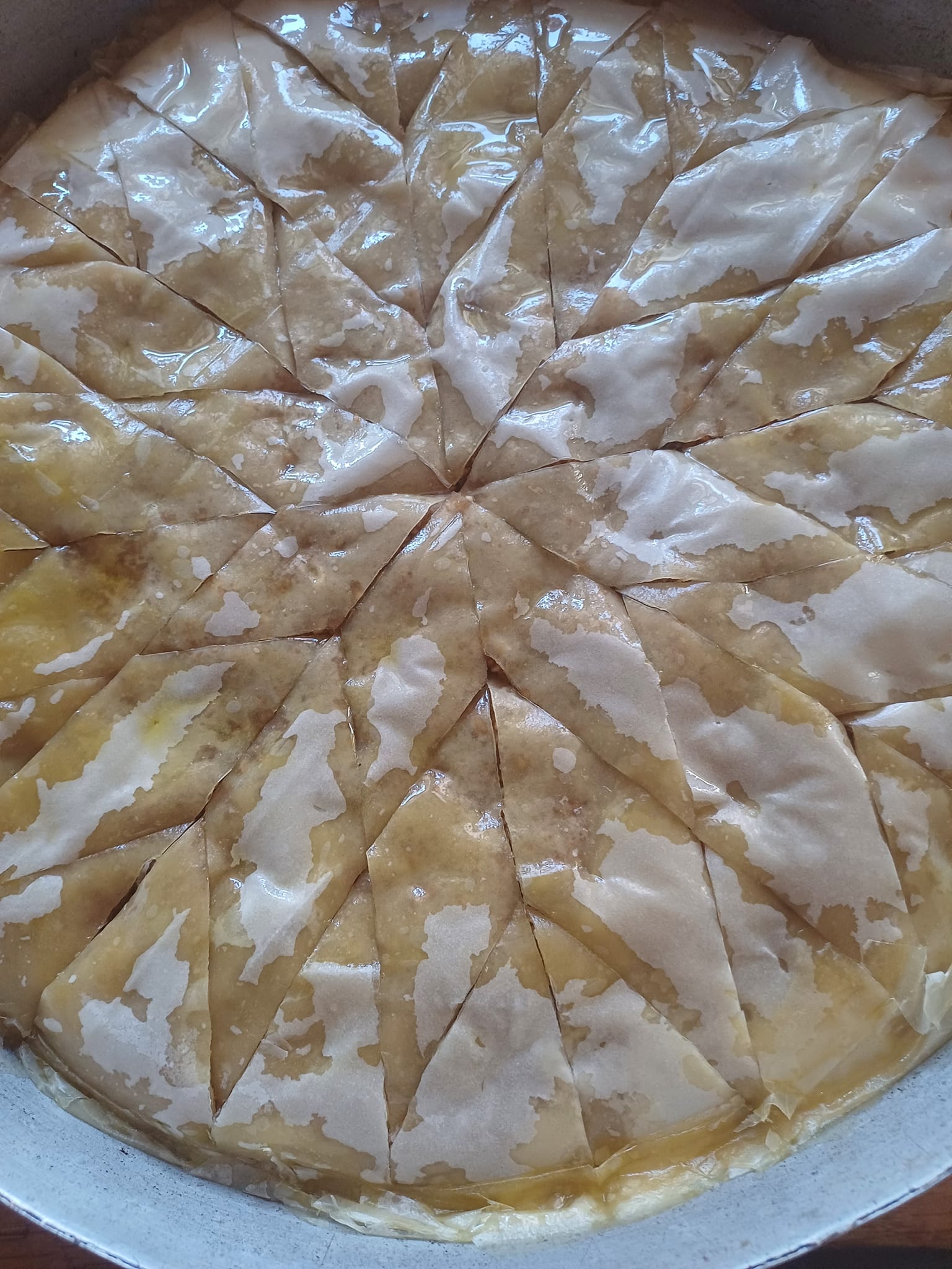 Συνεχίζω τη διαδικασία μέχρι να μου μείνουν 3 φύλλα για το τέλος, βάζοντας πάντα λάδι ανάμεσα στα φύλλα. Πριν το βάλω στον φούρνο, το καταβρέχω με νερό. Το κόβω σε όποιο σχέδιο θέλω