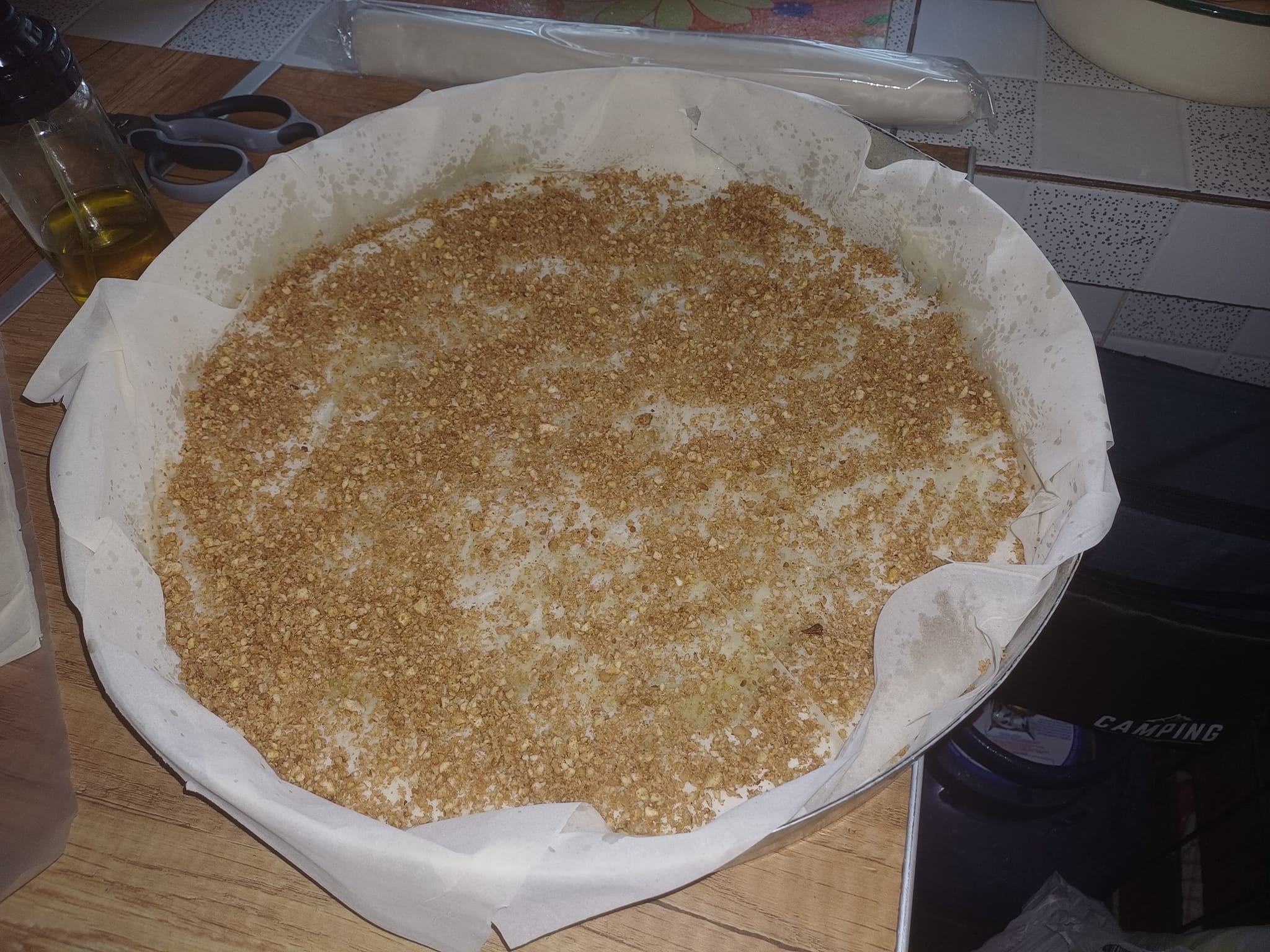 Παίρνω ένα στρογγυλό ταψί, το αλείφω με λάδι και στρώνω 3 φύλλα κρούστας, βάζοντας λάδι ανάμεσα στο κάθε φύλλο. Σε ένα μπολ, ανακατεύω όλα τα υλικά για τη γέμιση μαζί. Έπειτα, ξεκινάω το στρώσιμο της γέμισης, εναλλάξ με τα φύλλα, δηλαδή ένα φύλλο, γέμιση, ένα φύλλο, γέμιση.