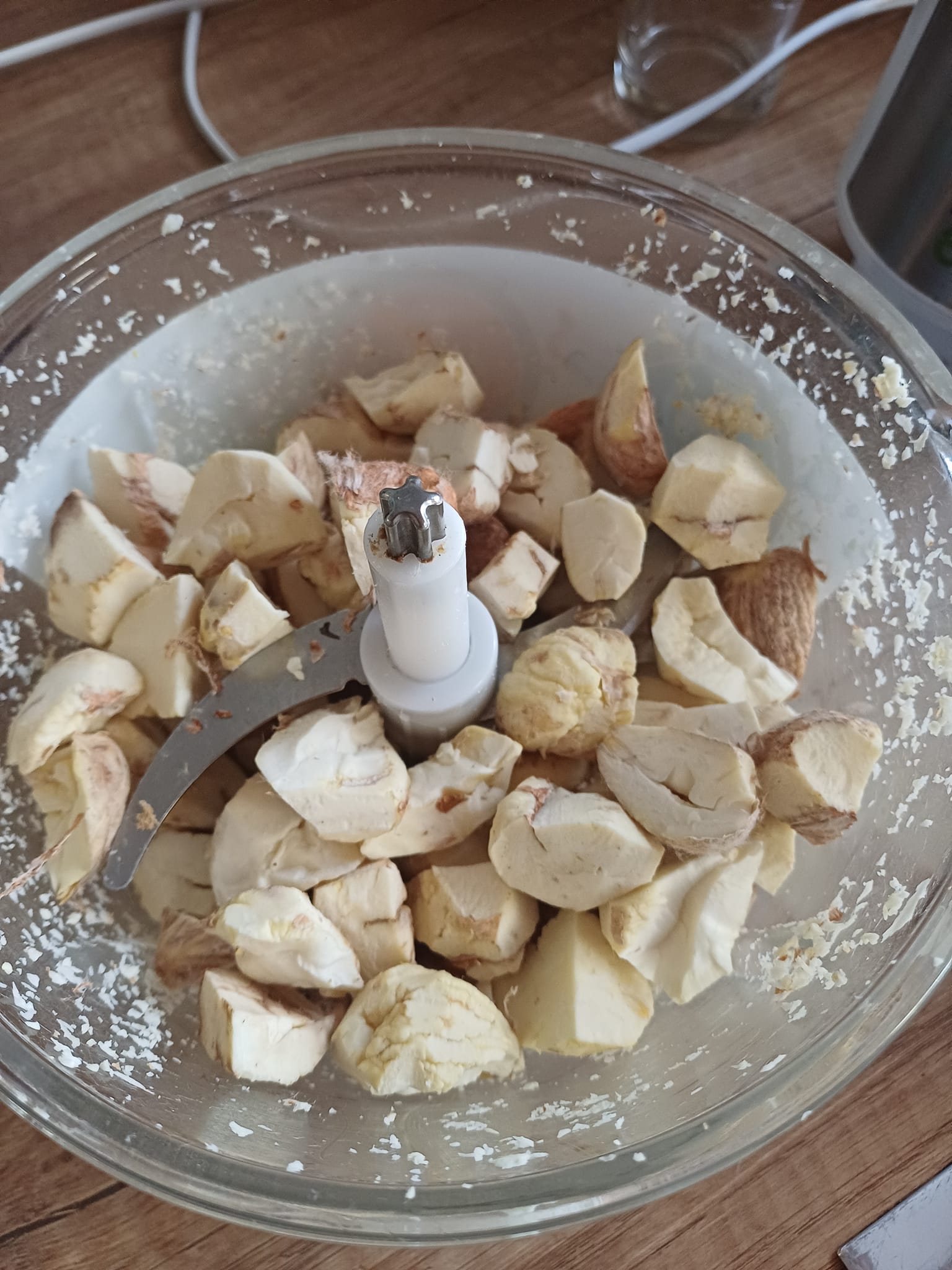 - 2 κιλά κάστανα, καθαρισμένα και τριμμένα στο μούλτι (ωμά)