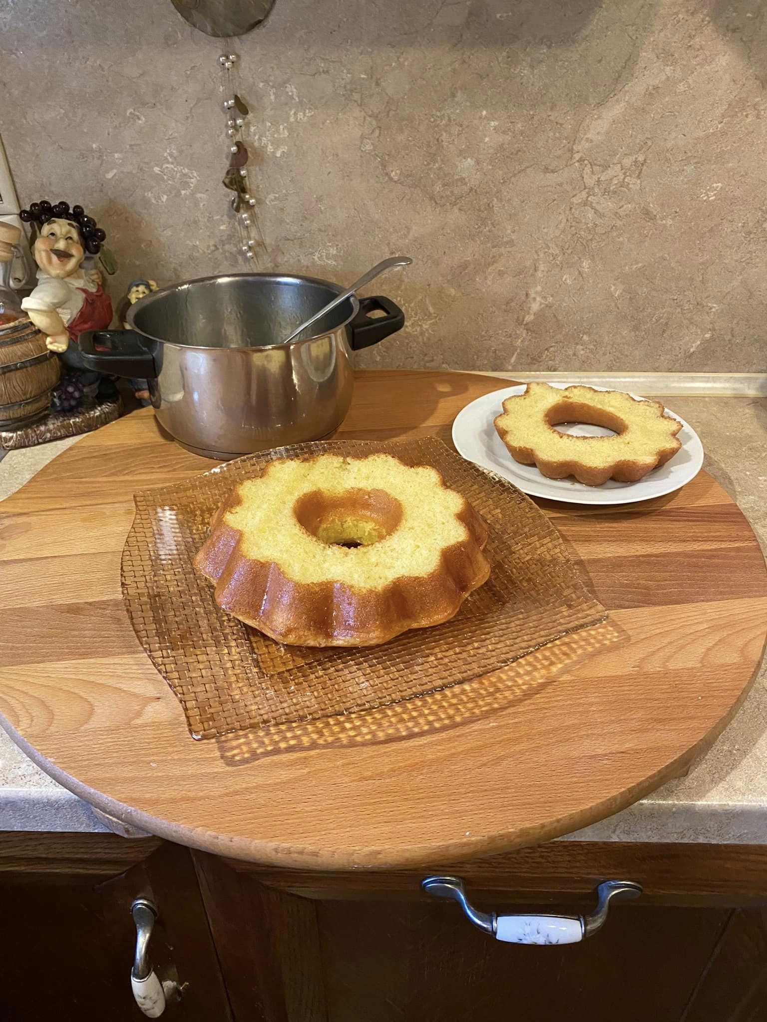 Σιροπιάζουμε μόλις βγει από φούρνο (αφού κάνουμε τρυπούλες στην επιφάνεια με οδοντογλυφιδα) με το χλιαρό σιρόπι που έχουμε ήδη ετοιμάσει όσο ο μπαμπάς ψηνόταν, βραζοντας τα υλικά για 5 λεπτά.