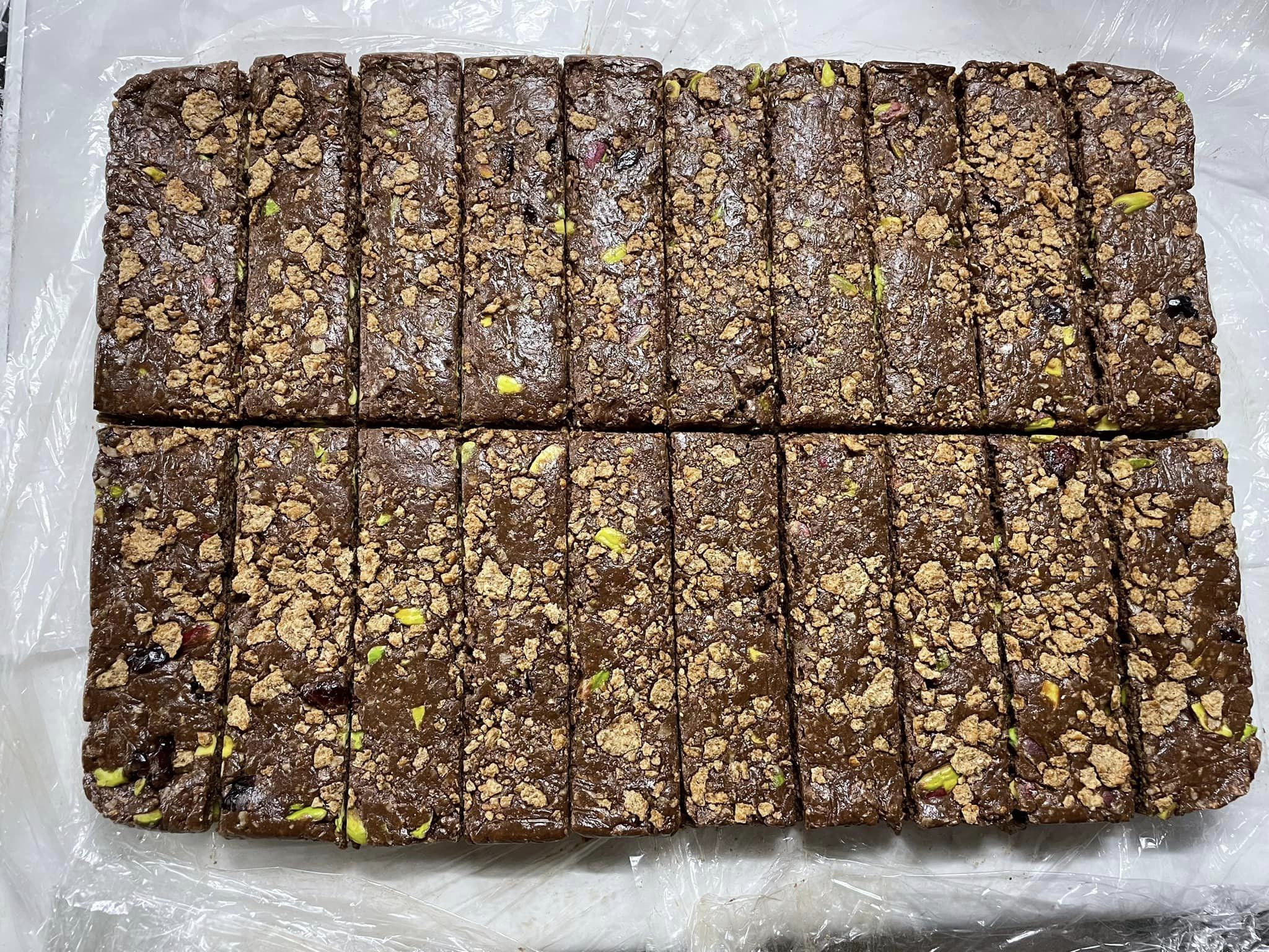 τουλάχιστον 3-4 ώρες να κρυώσει καλά και κόβουμε σε κομμάτια. Βγαίνουν 20 μπάρες. Τις τύλιξα μια μια σε μεμβράνη και τις κρατάμε ψυγείο!!