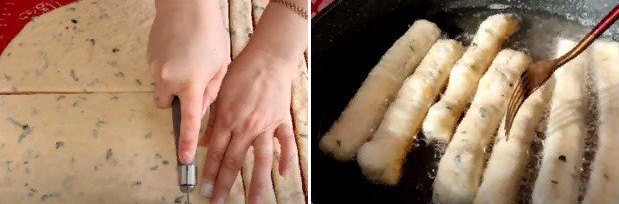Κόβουμε τη ζύμη σε μικρά μπαστουνάκια με ένα μαχαίρι. Τα τηγανίζουμε σε τηγάνι σε καυτό λάδι. Φυσικά μέχρι να ροδίσουν.