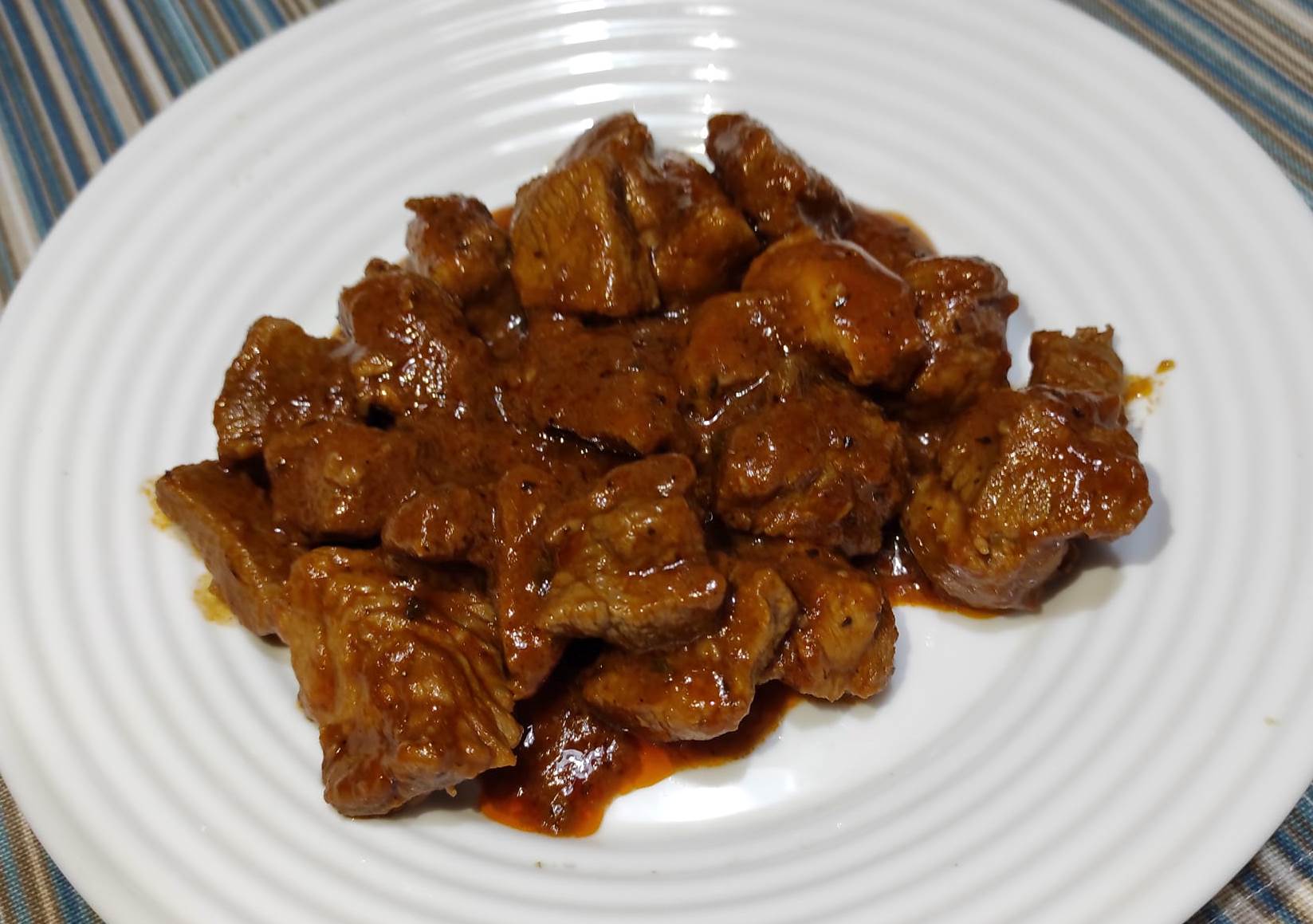 Βάζουμε το κρέας σ’ ένα μπολ, ρίχνουμε τη μουστάρδα κι ανακατεύουμε ώσπου να λερωθούν όλα τα κομματάκια. Σ’ ένα τηγάνι ζεσταίνουμε το λάδι και σοτάρουμε ελαφρά το σκόρδο και έπειτα το κρέας. Ρίχνουμε το κρασί σε τρεις δόσεις, ανακατεύοντας ελαφρά σε δυνατή φωτιά ώστε το κρασί να εξατμίζεται. Όταν τελειώσει το κρασί, προσθέτουμε τη ντομάτα, το ταμπάσκο, το μπαχάρι, αλάτι, πιπέρι και ρίγανη και βράζουμε για 15-20 λεπτά περίπου ώσπου να μαλακώσει το κρέας και να δέσει η σάλτσα. Σερβίρετε αμέσως