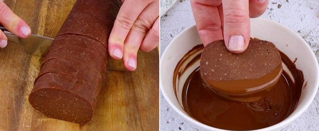 Μόλις παγώσουν, λιώνουμε 300 γρ. κουβερτούρα (στον φούρνο μικροκυμάτων ή σε μπεν μαρί) και περνάμε κάθε ένα μπαλάκι μέσα από τη λιωμένη σοκολάτα.