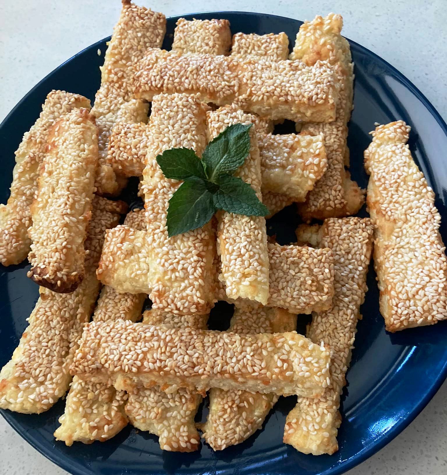 Τα ζυμώνουμε όλα μαζί τα στρώνουμε σε Λαμαρίνα με λαδόκολλα να έχει το ίδιο πάχος παντού κάνουμε ένα τετράγωνο κομμάτι Αλείφουμε με το αυγό ρίχνουμε μπόλικο σουσάμι το βάζουμε στο ψυγείο για μισή ώρα να παγώσει το κόβουμε Σε μπαστουνάκια και με το μαχαίρι όπως το κόβουμε ξεχωρίζουμε τα κομμάτια για να ψηθεί ομοιόμορφα στο φούρνο στους 200 βαθμούς 12 με 15 λεπτά