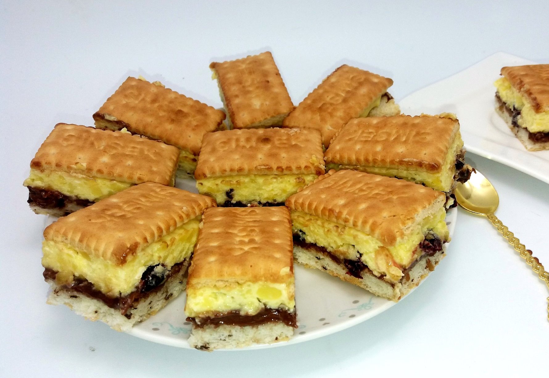 Βάζουμε μια στρώση κρέμα σοκολάτας πάνω από τον πάγκο που έχει κρυώσει (νουτέλα), προσθέτουμε την κρέμα και από πάνω βάζουμε μια στρώση μπισκότα.