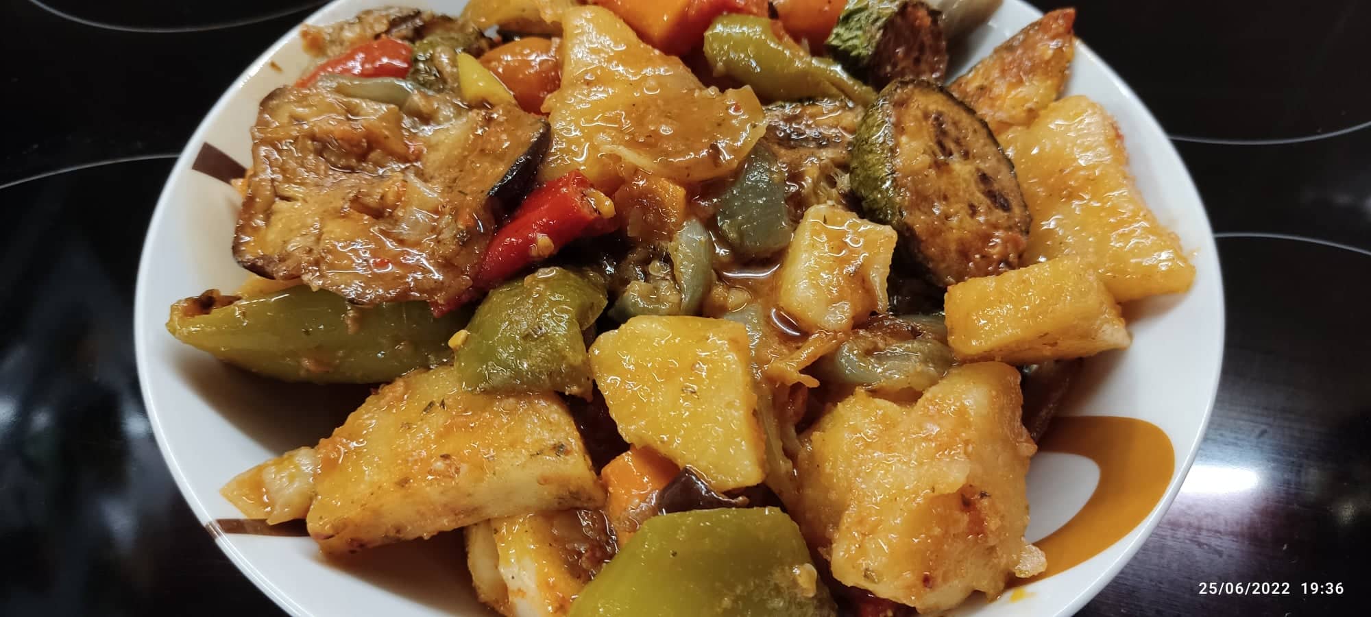 Κόβουμε τις μελιτζάνες,τα κολοκυθάκια,τις πατάτες,τις ντομάτες,τα κρεμμύδια,τις πιπεριές σαν μεγάλες μπουκές(γιατί στο ψήσιμο θα μικρύνουν) τα καρότα σε φέτες,και το σκόρδο ψιλοκομμένο.
