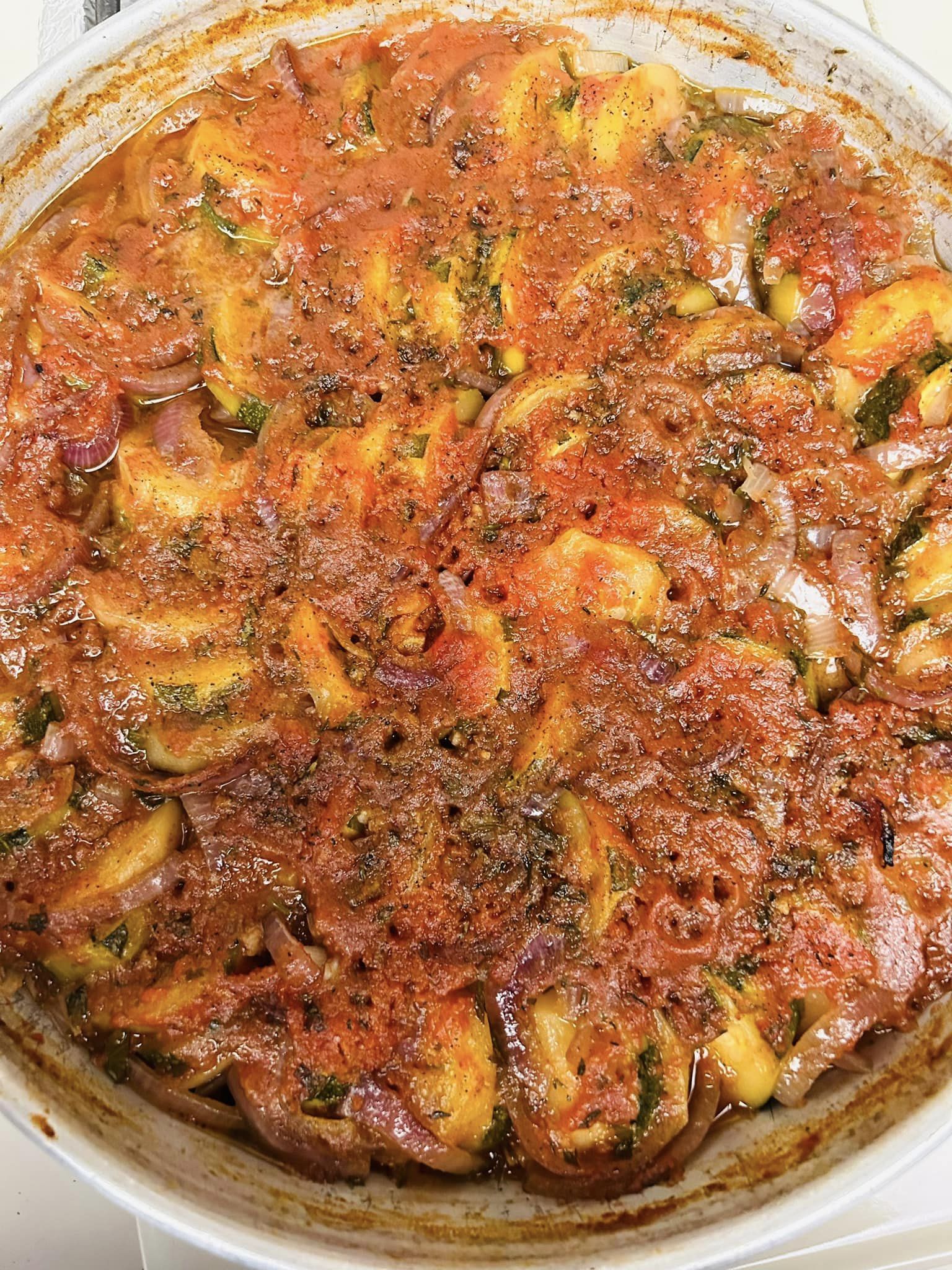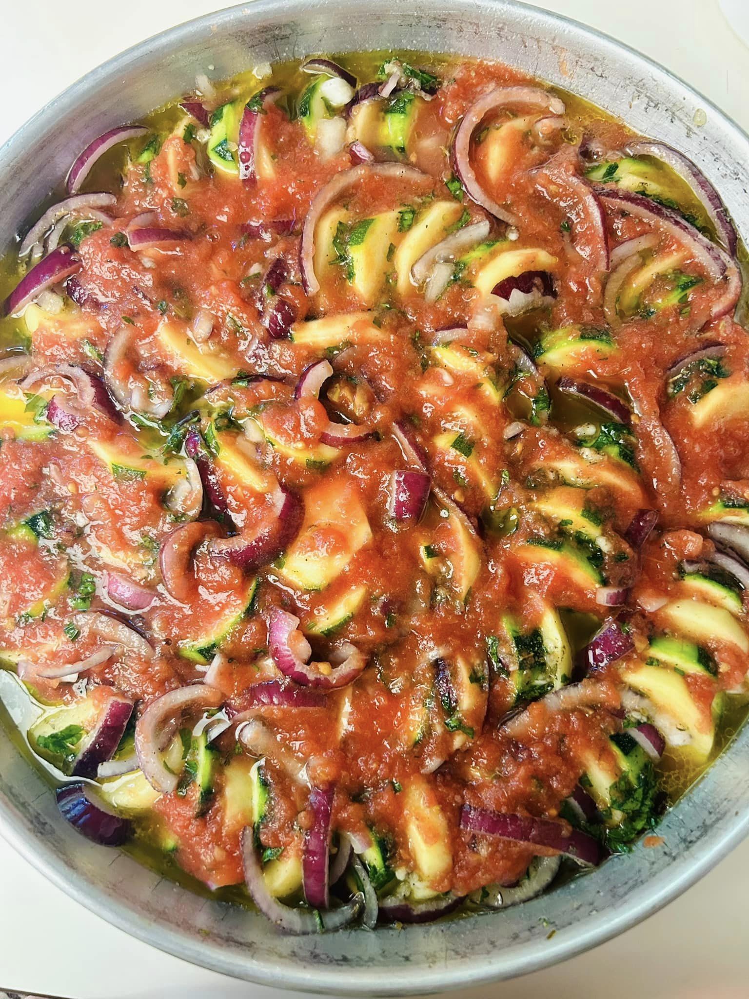 Χρησιμοποιήστε ένα μεγάλο στρογγυλό ταψί μεγέθους περίπου 28 εκ, αλείψτε με ελαιόλαδο, μετά ρίξτε τις μισές ντομάτες θρυμματισμένες και στη συνέχεια συναρμολογήστε τα λαχανικά εναλλάξ πατάτες και κολοκυθάκια,
