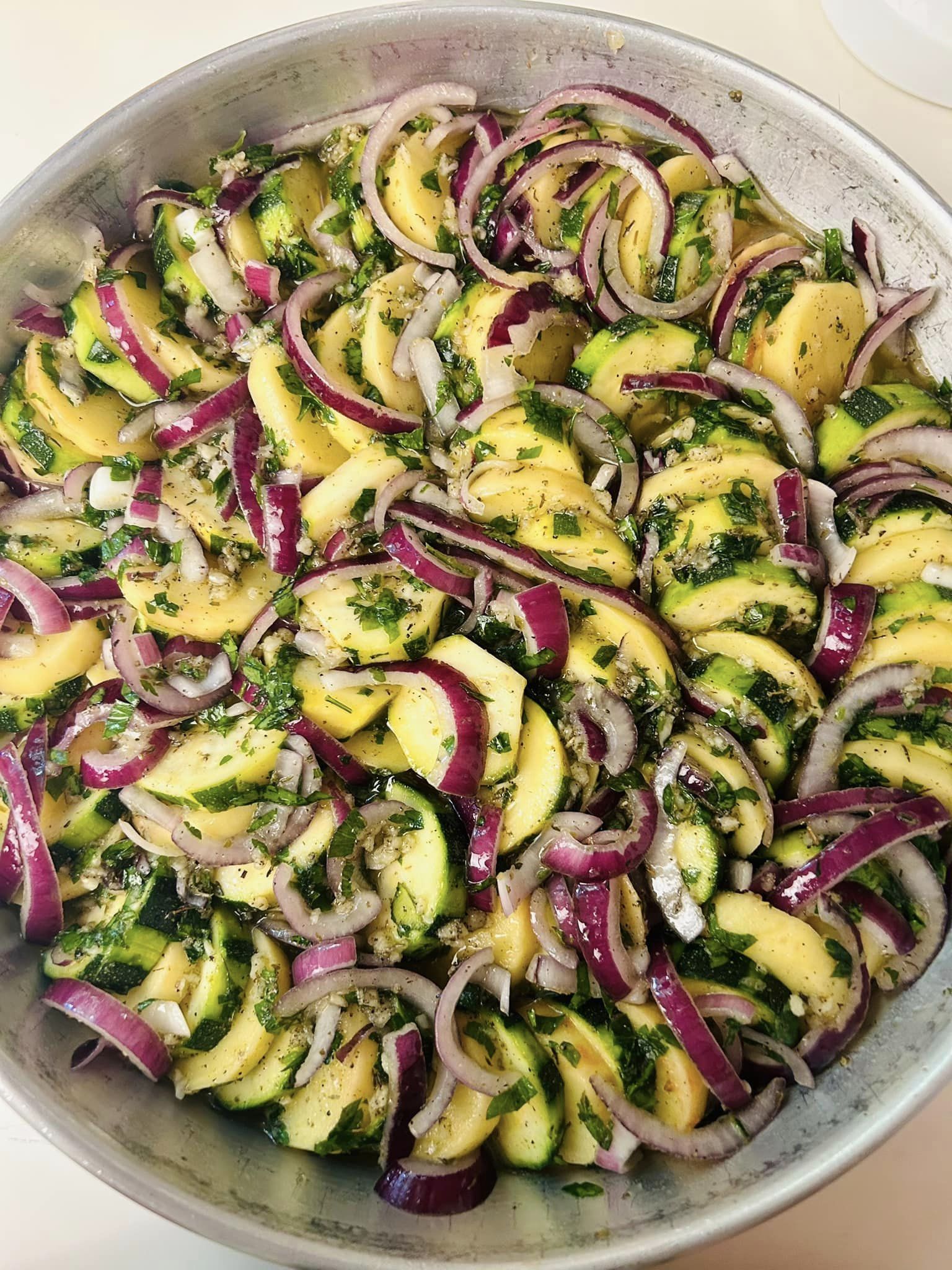 Σε ένα μεγάλο μπολ, προσθέστε τις πατάτες, τα κολοκυθάκια και τα κρεμμύδια σας καθώς και το ελαιόλαδο, το αλάτι, το πιπέρι, τα μυρωδικά και το σκόρδο ανακατεύοντας και αφήστε τα στην άκρη.