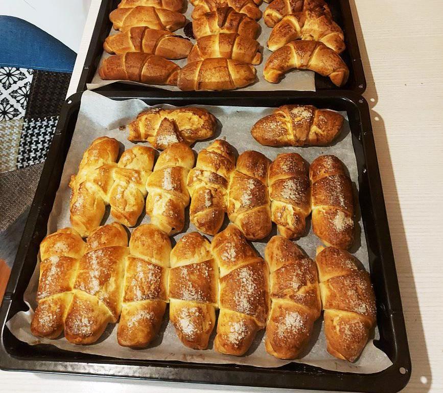 Μόλις τελειώσω τα σκεπάζω και αφήνω 30 λεπτά να φουσκώσουν, Αλειφω με κρόκο αυγού, και πασπαλίζω ζάχαρη και ψήνω σε θερμαινόμενο φούρνο 160 βαθμούς στον ανεμιστήρα μέχρι να ροδίσουν. Έβαλα τους δύο δίσκους με τη μία 😉 Αααχχ, περιμένω να κρυώσουν!