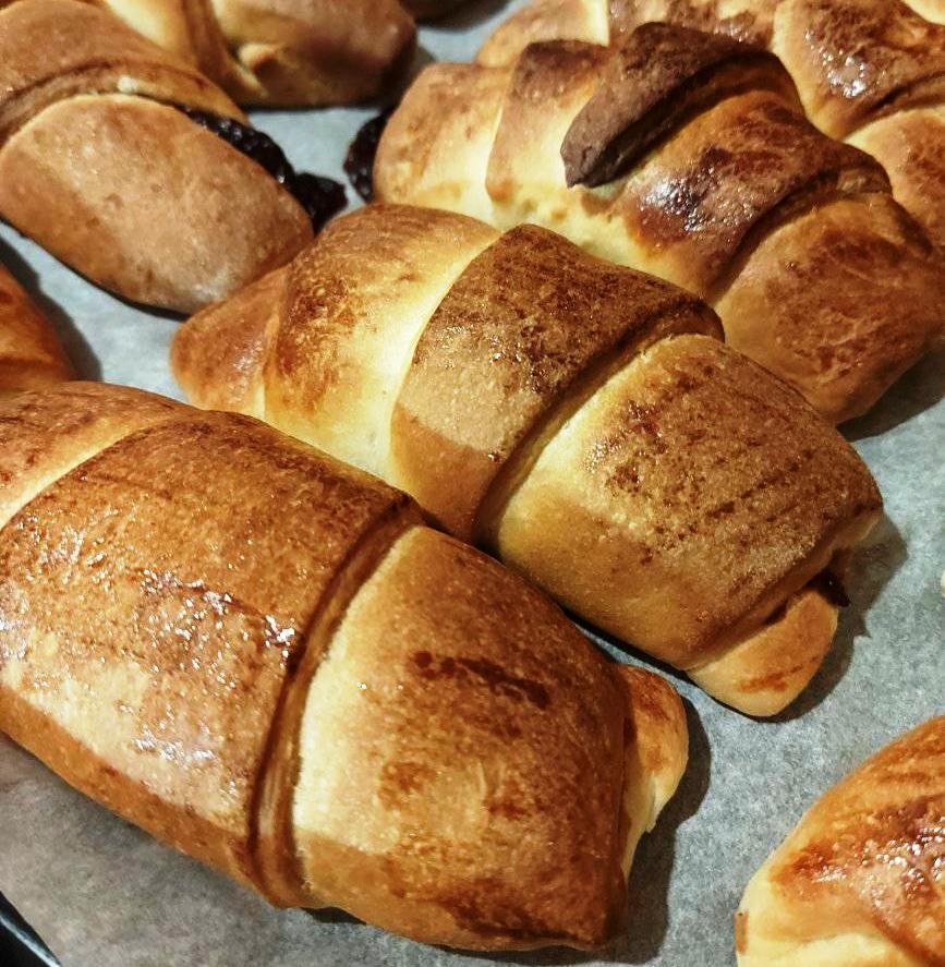 Σκεπάζω την ζύμη σε ένα μπολ και την αφήνω να φουσκώσει για 1 ωρα, μετά την κάνω ένα κορμο και την χωρίζω σε τέσσερα μέρη. Με ένα πλάστη άνοιξα τις 4 ζύμες και έκοψα κάθε μέρος σε 8 τρίγωνα. Βάζω μία κουταλιά γέμιση στην φαρδιά βάση του τριγώνου και τυλίγω προς την στενή. Τοποθετώ σε ταψιά στρωμένα με χαρτί ψησίματος.