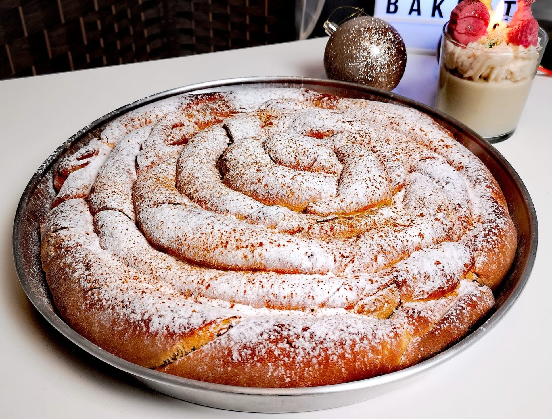 Την αφήνουμε να κρυώσει και την πασπαλίζουμε με άχνη και κανέλα . Μπορεί να δοκιμαστεί και ζεστή και κρύα .