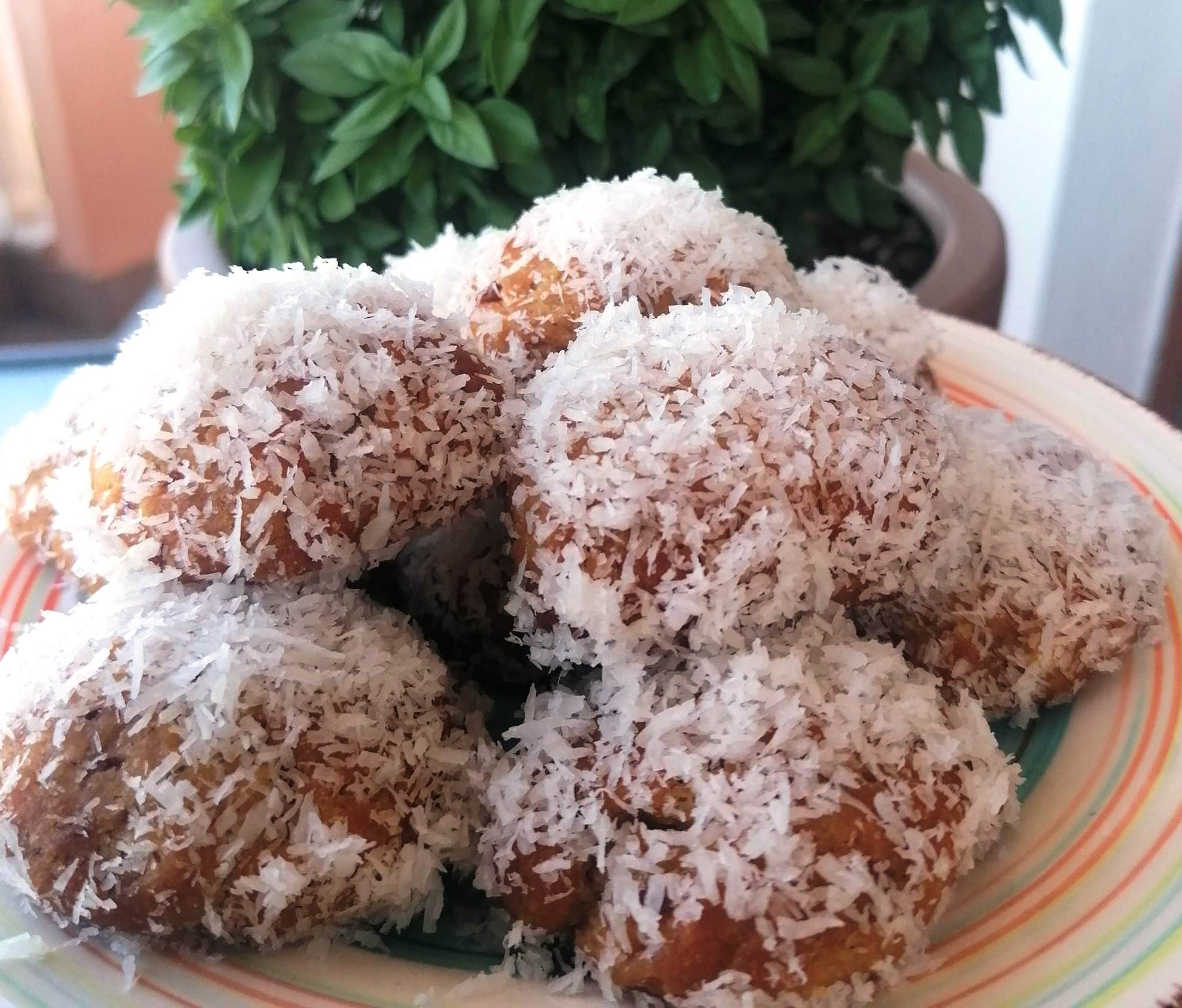 Σε ένα μπολ αναμιγνύουμε την ανθρακούχα πορτοκαλάδα, το καλαμποκελαιο, τα ξύσματα, το ινδοκαρυδο, το καρύδι και έπειτα προσθέτουμε το φαριν απ λίγο λίγο, απλά ανακατεύοντας απαλά. Δεν ζυμώνουμε. Δεν χρειάζεται όλο το αλεύρι που φουσκώνει μόνο του. Θα περισσέψει λίγο. Αμέσως μόλις, πάρει μορφή η ζύμη, σταματάμε το ανακάτεμα. Προθερμαινουμε το φούρνο και στρώνουμε λαδόκολλα σε ένα ταψί. Πλάθουμε μικρά μπαλάκια όσο ένα μικρό καρύδι και τα πιέζουμε ελαφρώς. Τα αραδιάζουμε και φροντίζουμε να έχουν λίγη απόσταση μεταξύ τους. Ψήνουμε στους 180-190′ στις αντιστάσεις για 20-25 ‘ μέχρι να ροδίσουν πάνω και κάτω. Θέλουμε να ψηθούν καλά, αλλιώς θα διαλυθούν στο σιροπιασμα.