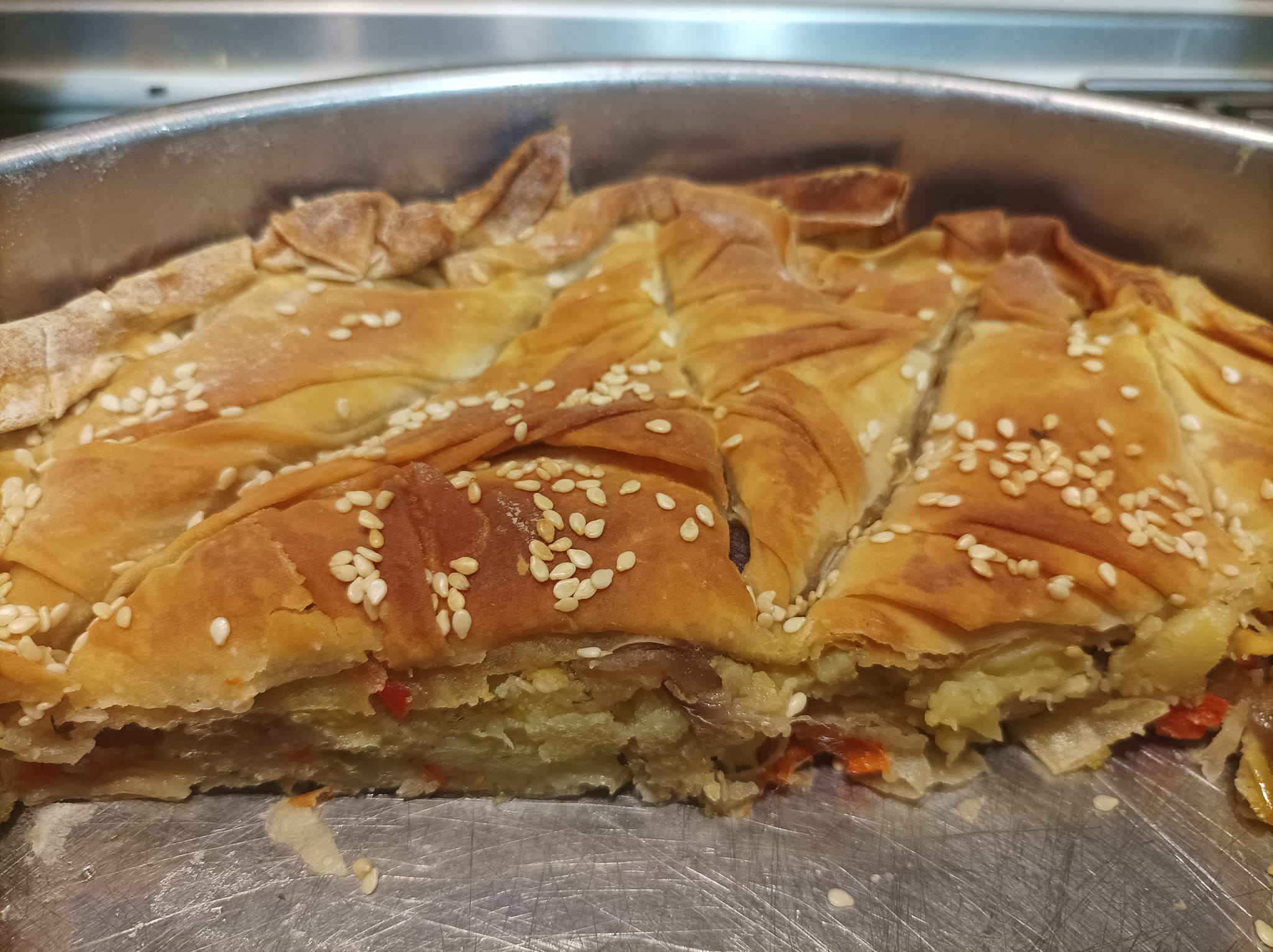 Η ζύμη αγκαλιάζει τρυφερά τα λευκά πατατάκια και τα πράσα, που έχουν σοταριστεί με κρεμμύδι και καρότο. Η γέμιση, αρωματισμένη με άνηθο και μαϊντανό, γίνεται ζουμερή και χυλωμένη, χάρη στην προσθήκη ντομάτας και χυμού λεμονιού.