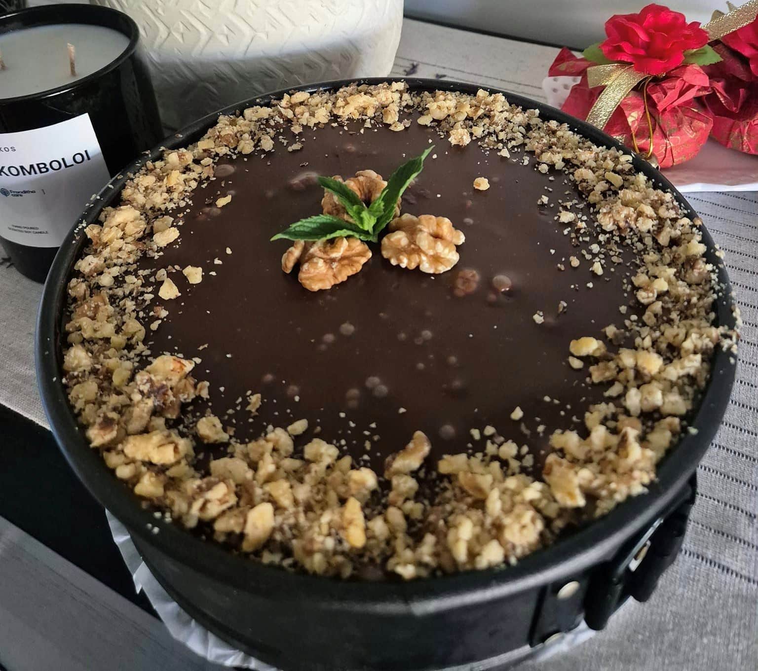 6. Τελικό Στάδιο: Απλώνουμε την γκανάς πάνω από το γλυκό, στολίζουμε με τα καρύδια και βάζουμε στο ψυγείο, ιδανικά για όλο το βράδυ