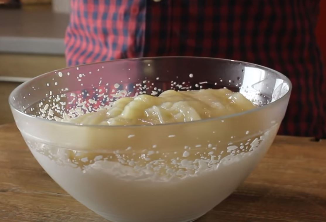 Σκεπάζουμε το μείγμα-κρεμα με μία μεμβράνη που εφάπτεται του μείγματος και αφήνουμε να κρυώσει τελείως.