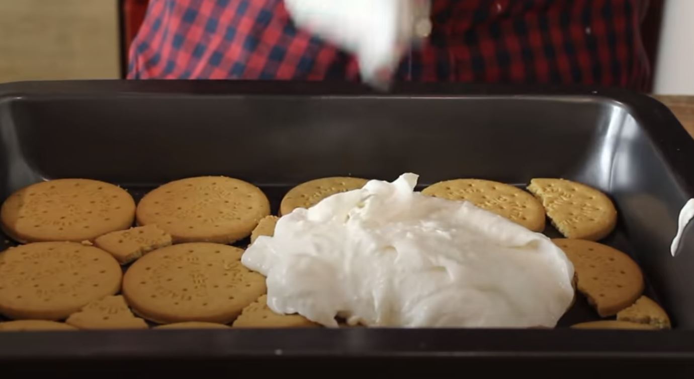 Στρώνουμε σε ένα ταψί στην βάση τα μπισκότα και απο πάνω απλώνουμε μια στρώση απο το μισό μειγμα κρεμας-σαντιγύ.