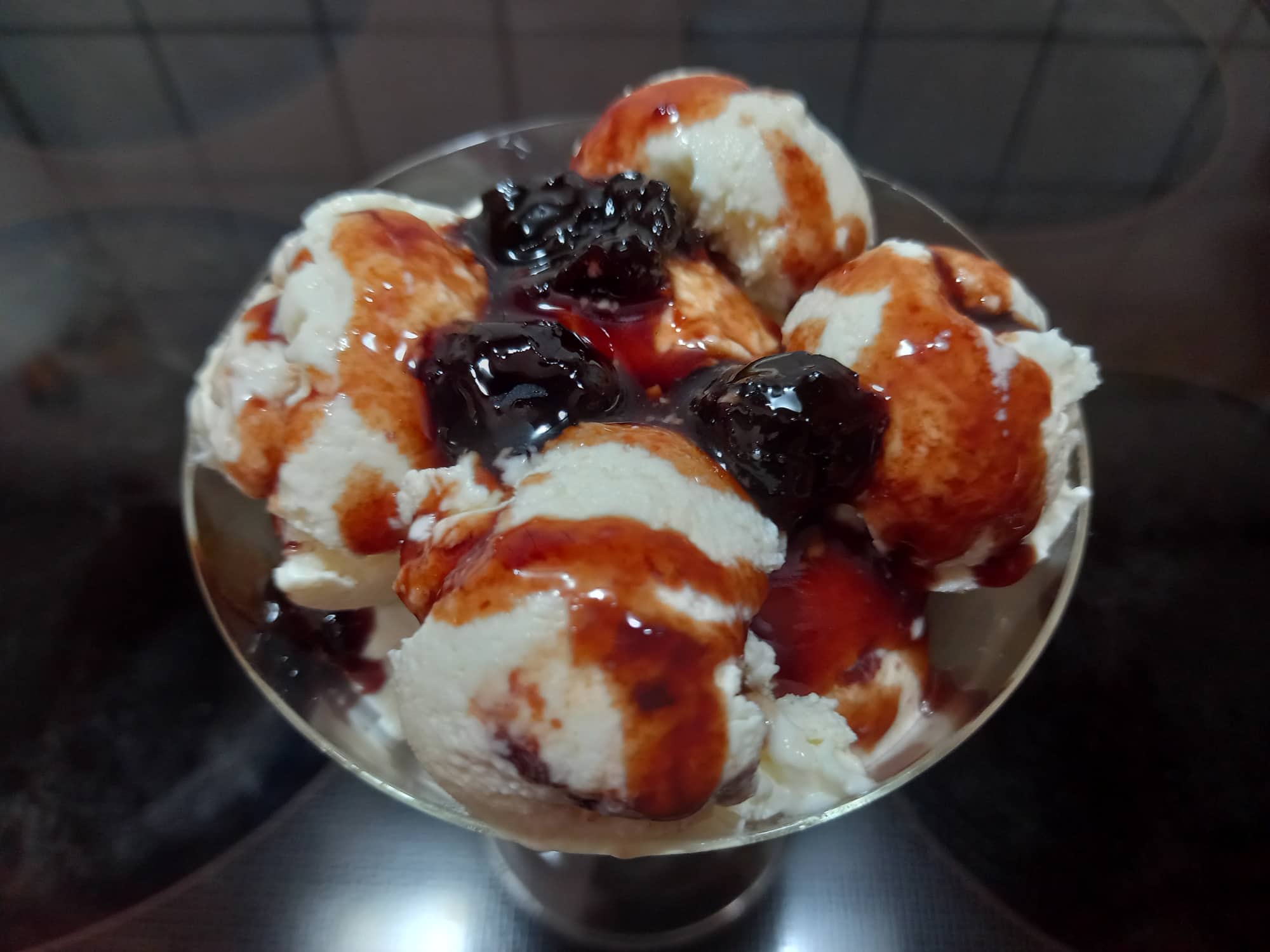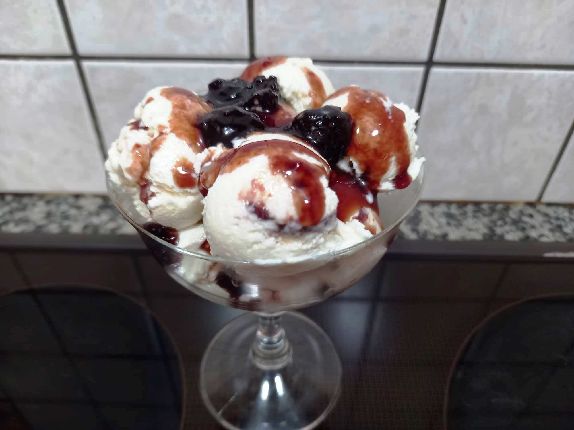 Ρίχνουμε το μισό μείγμα σε ένα μπολ παγωτού η γυάλινο σκεύος προσθέτουμε όσο σιρόπι και γλυκό βύσσινο θέλουμε και στη συνέχεια αδειάζουμε το υπόλοιπο μείγμα.