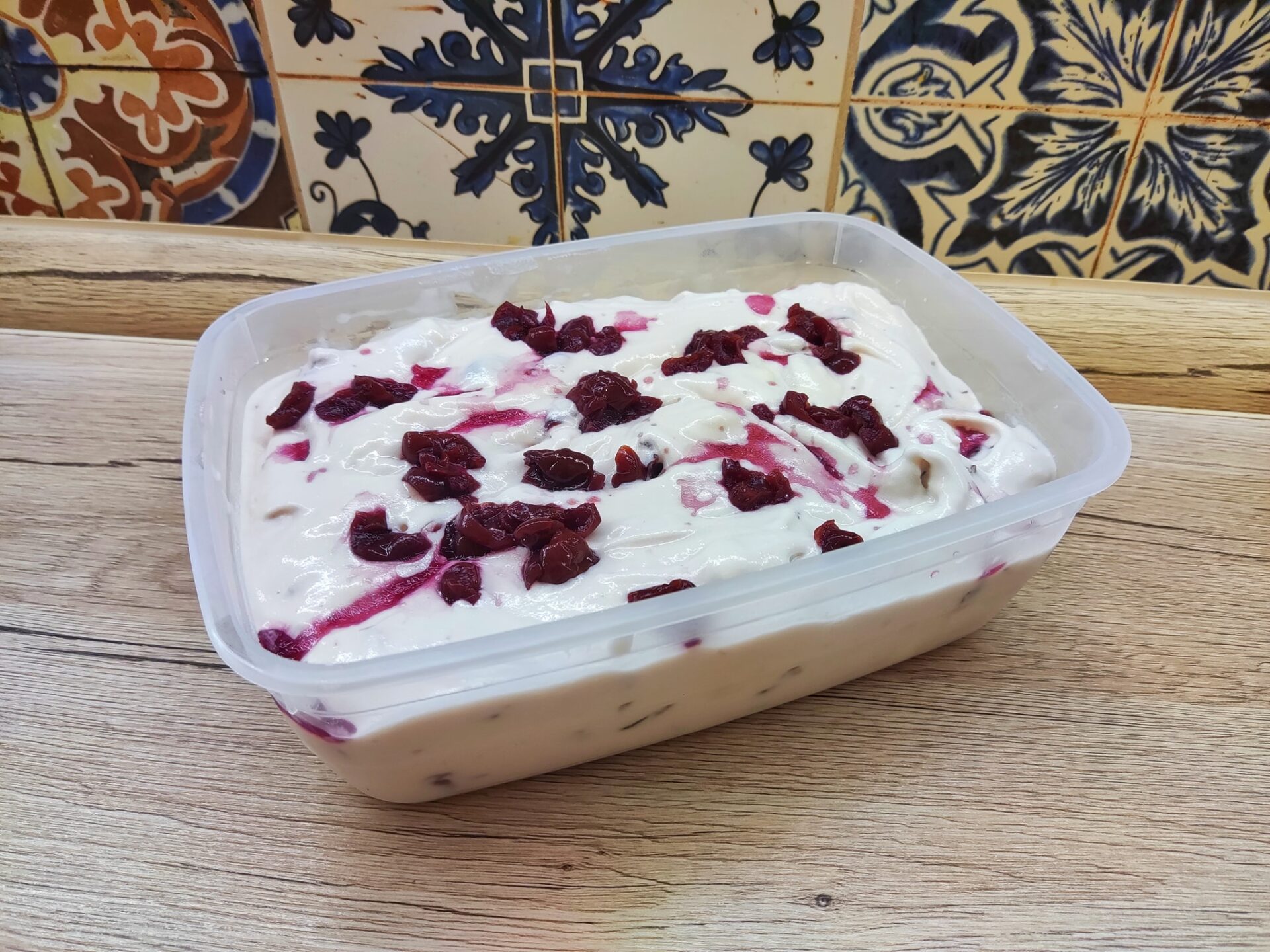 Την επόμενη μέρα το αδειάζω στην παγωτομηχανή και όταν γίνει κρέμα βάζω τα κεράσια κομμένα σε φέτες και το τοποθετώ στην κατάψυξη.