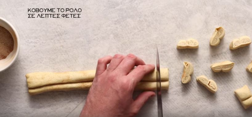 Σε μια επίπεδη επιφάνεια εργασίας, απλώστε ένα λεπτό στρώμα ζάχαρης και ξεδιπλώστε ένα φύλλο ζύμης πάνω στη ζάχαρη. Διαμοιράστε ομοιόμορφα ένα στρώμα ζάχαρης πάνω από τη ζύμη που είναι σίγουρο ότι θα καλύψει ολόκληρη την επιφάνεια. Με ένα πλάστη, κυλήστε τη ζύμη έως ότου ανοίξετε ένα φύλλο 33 × 33 εκ τετράγωνο.