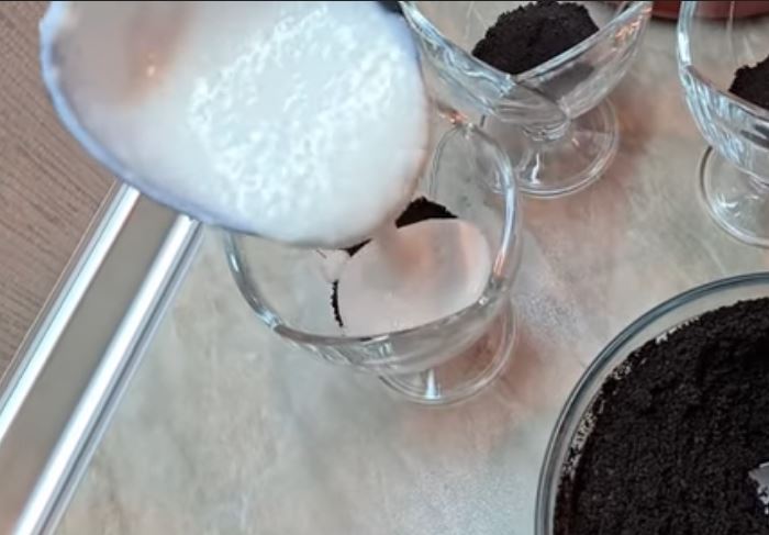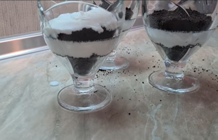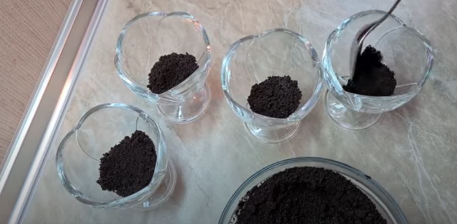 Σε κάθε γυάλινο μπολάκι βάζουμε 1 κσ μπισκότο τριμμένο και το πατάμε με το κουτάλι.