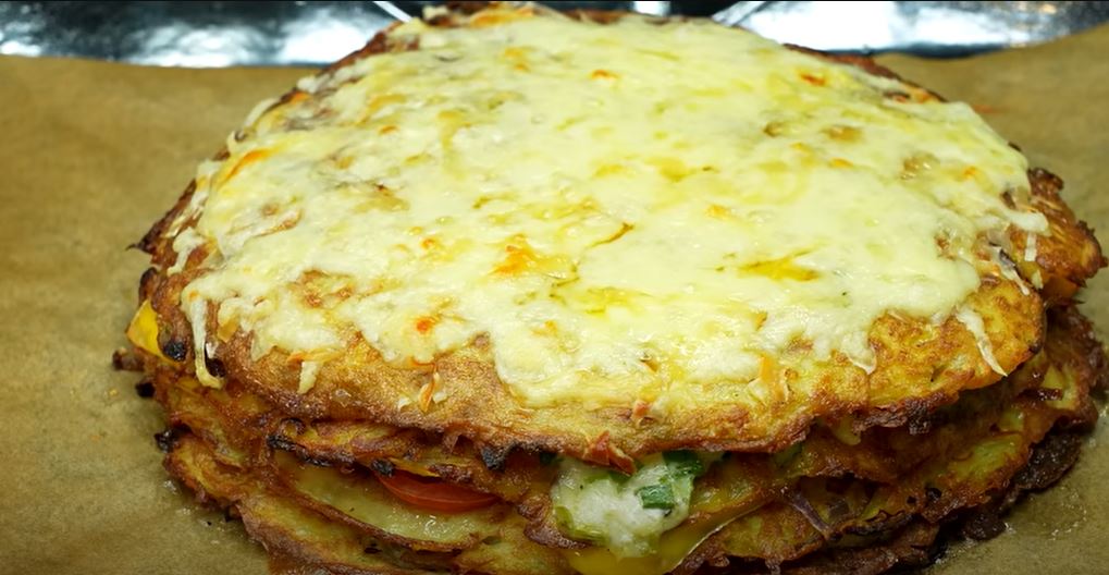 Απλώνουμε το υπόλοιπο μείγμα με τα φρέσκα κρεμμυδάκια και σκεπάζουμε με την τελευταία ομελέτα.Πασπαλίζουμε με το τυρί που είχαμε κρατήσει.