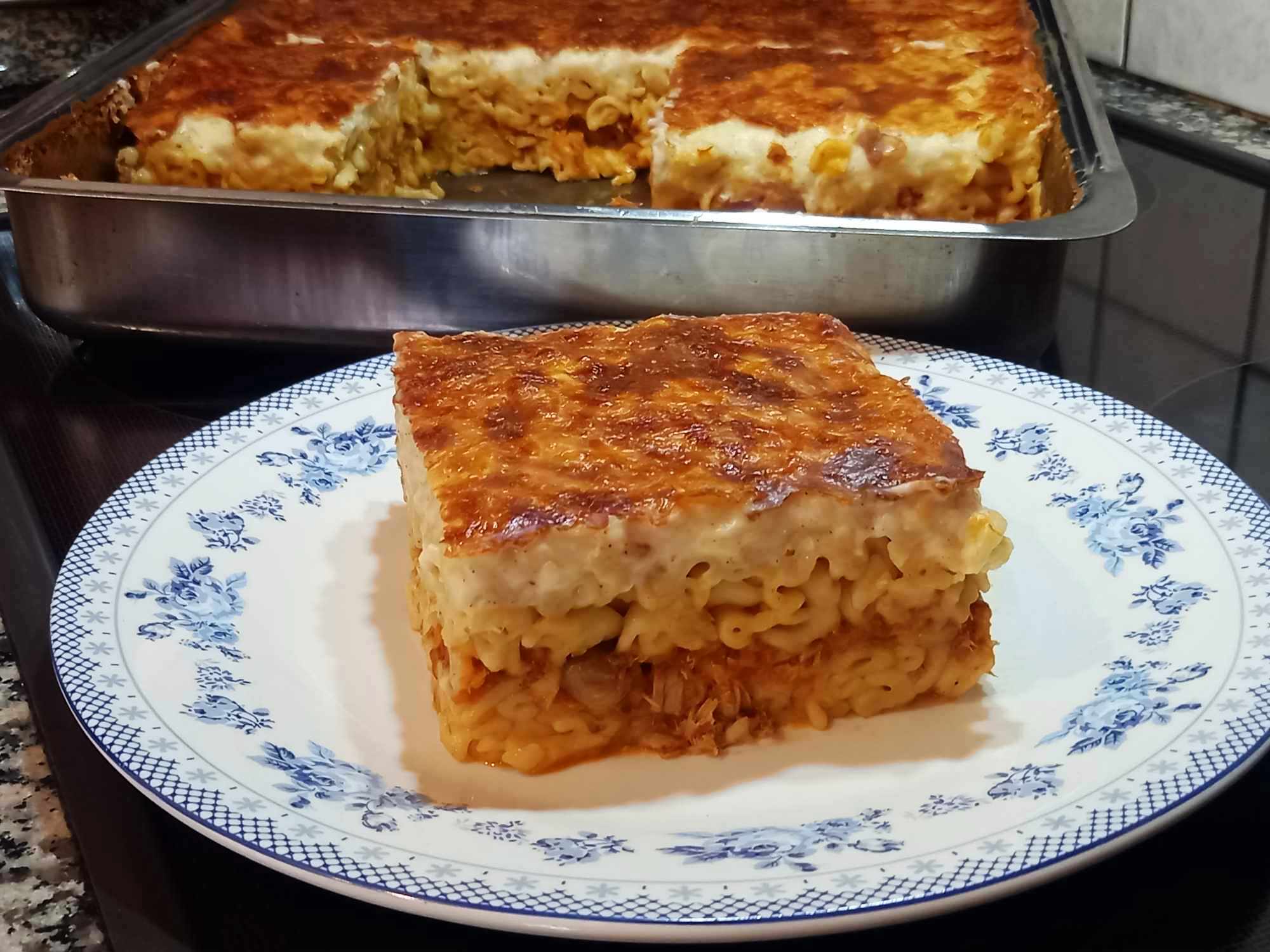 Λαδώνουμε το ταψί της κουζίνας και ρίχνουμε τα μισά μακαρόνια.Βάζουμε το μείγμα του τόνου και ρίχνουμε από πάνω τα υπόλοιπα μακαρόνια.