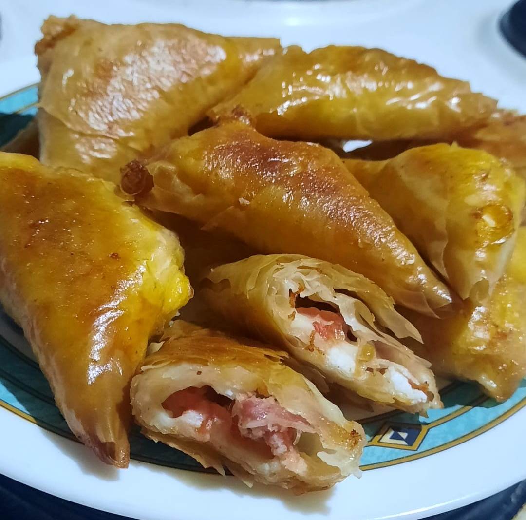 - Έβαλα 1 κ.σ. γέμιση στην κάτω γωνία του φύλλου,τύλιξα τριγωνακι και αλειψα λίγο λάδι εκεί που κλείνει για να κολλήσει. Εγώ τα τηγάνισα φίλοι μου σήμερα όμως γίνονται εξίσου νόστιμα και στο φούρνο!!!.